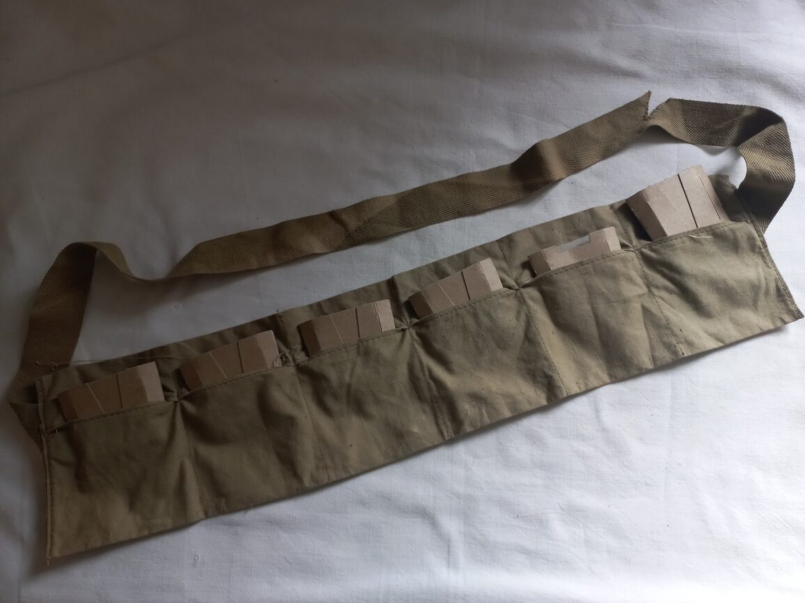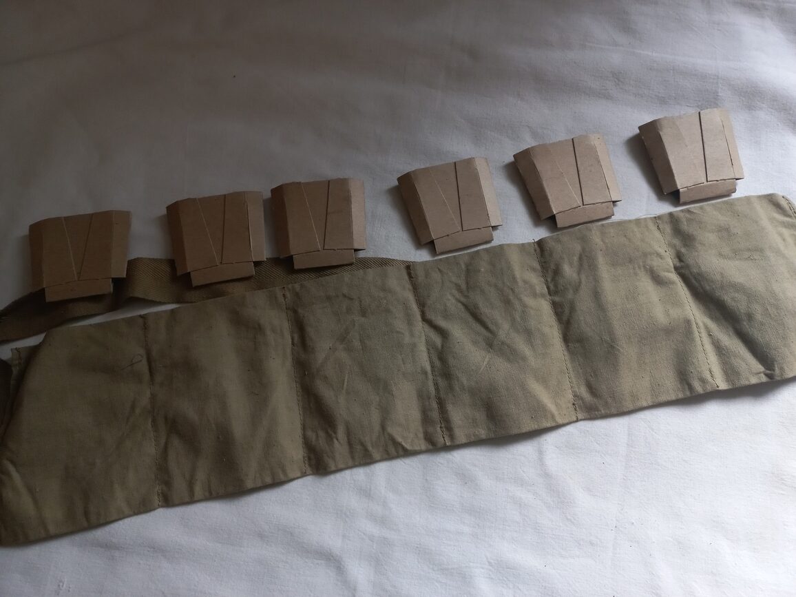 Bandoleer en TBE vendue avec 6 cartons pour clips de M1. L’ensemble est original mais sans doute après guerre. A noter une coupure sur la sangle.