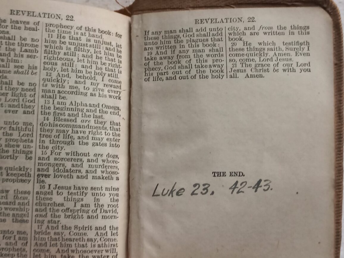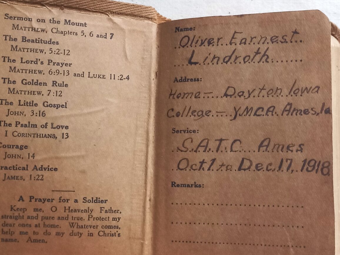 Bible « New Testament »  de 463 pages en TBE avec reliure correcte ayant appartenu au soldat OLIVER EARNEST LINDROTH et marquée de 1918.