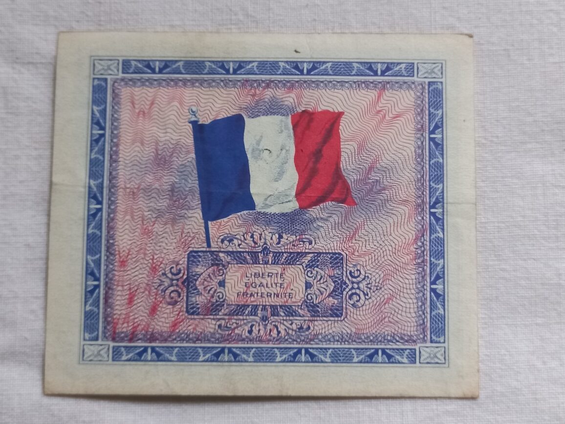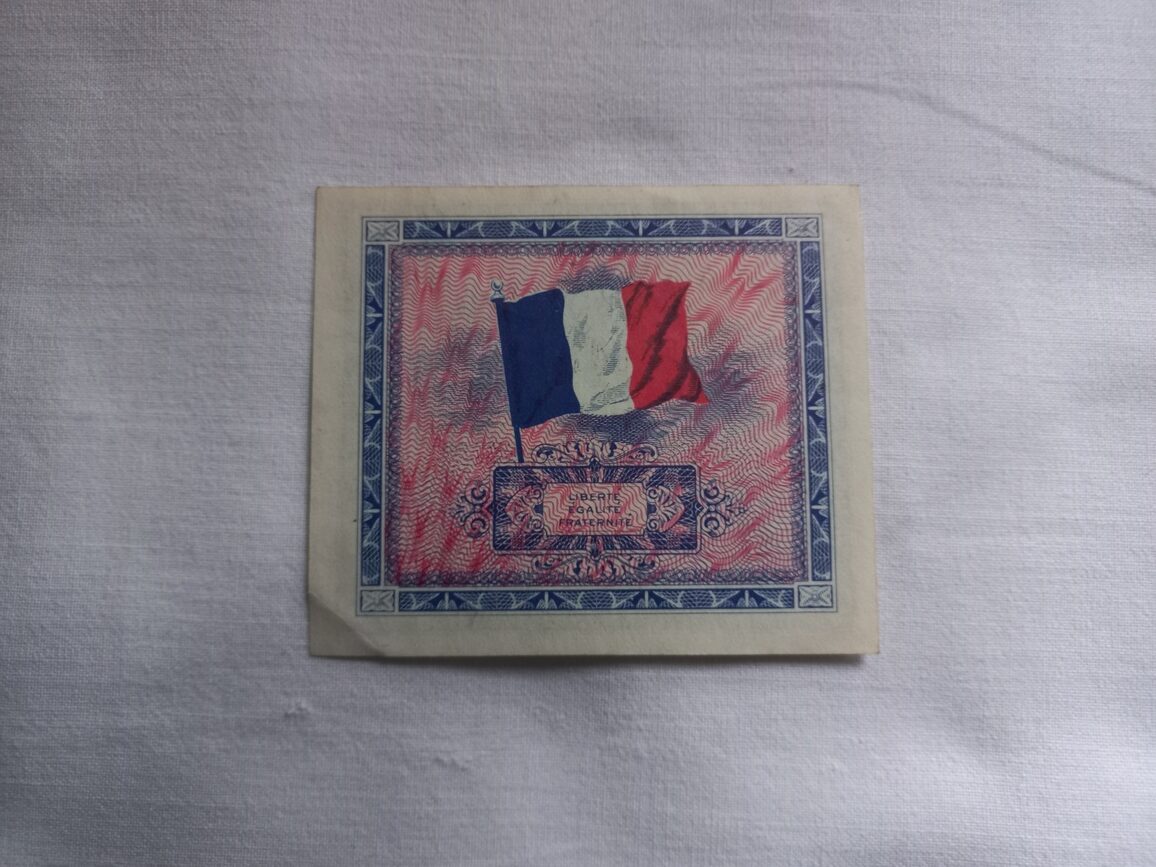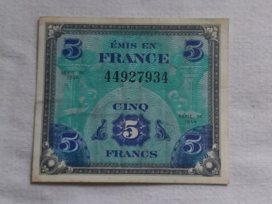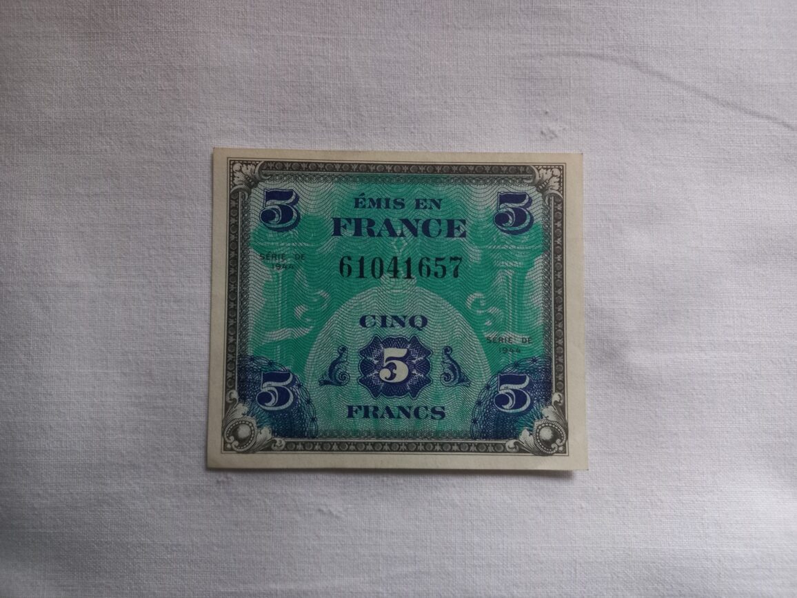 Billet de 5 francs d’origine en TBE imprimé en 1944 par les USA et utilisé pour le paiement de la solde des GI en France.
