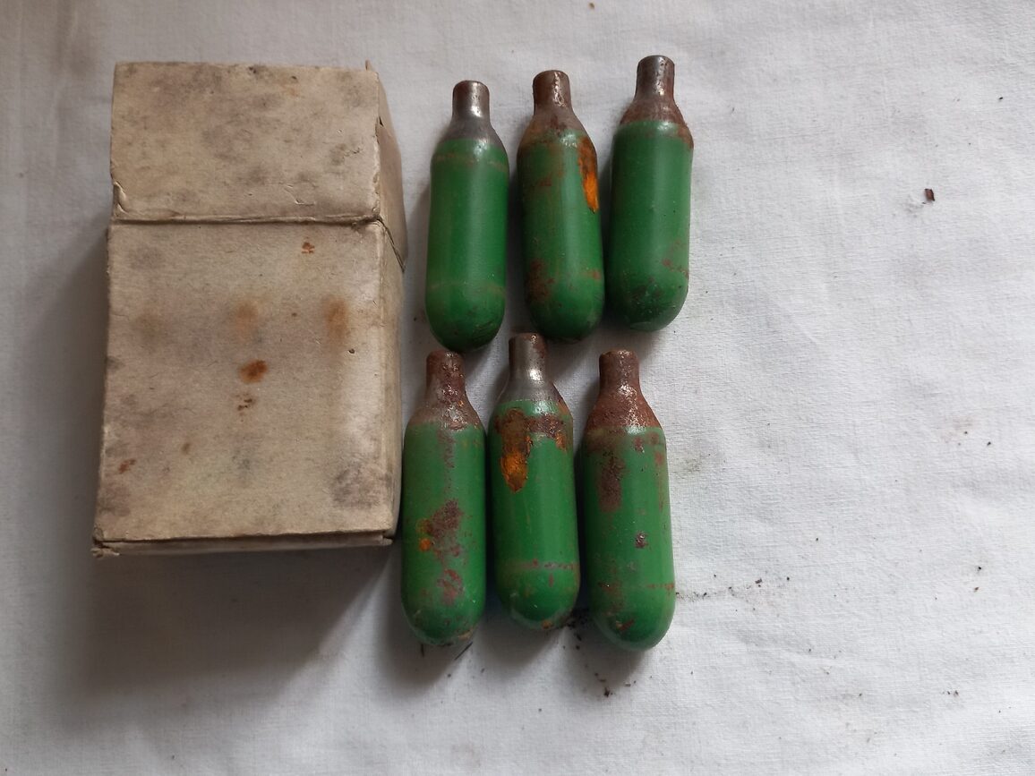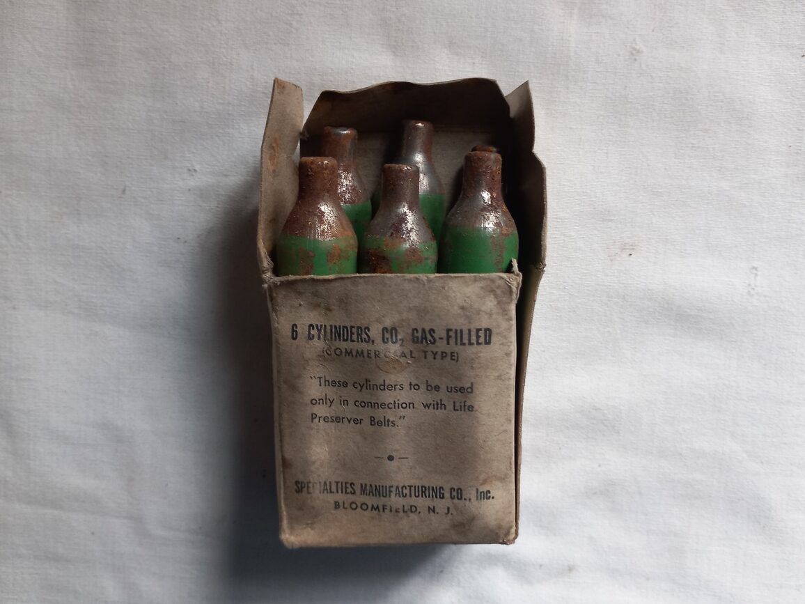 Cartouches de CO2 équipant les MAE WEST et les ceintures de sauvetage M26 en boite d’origine. Présence de corrosion non perforante.
