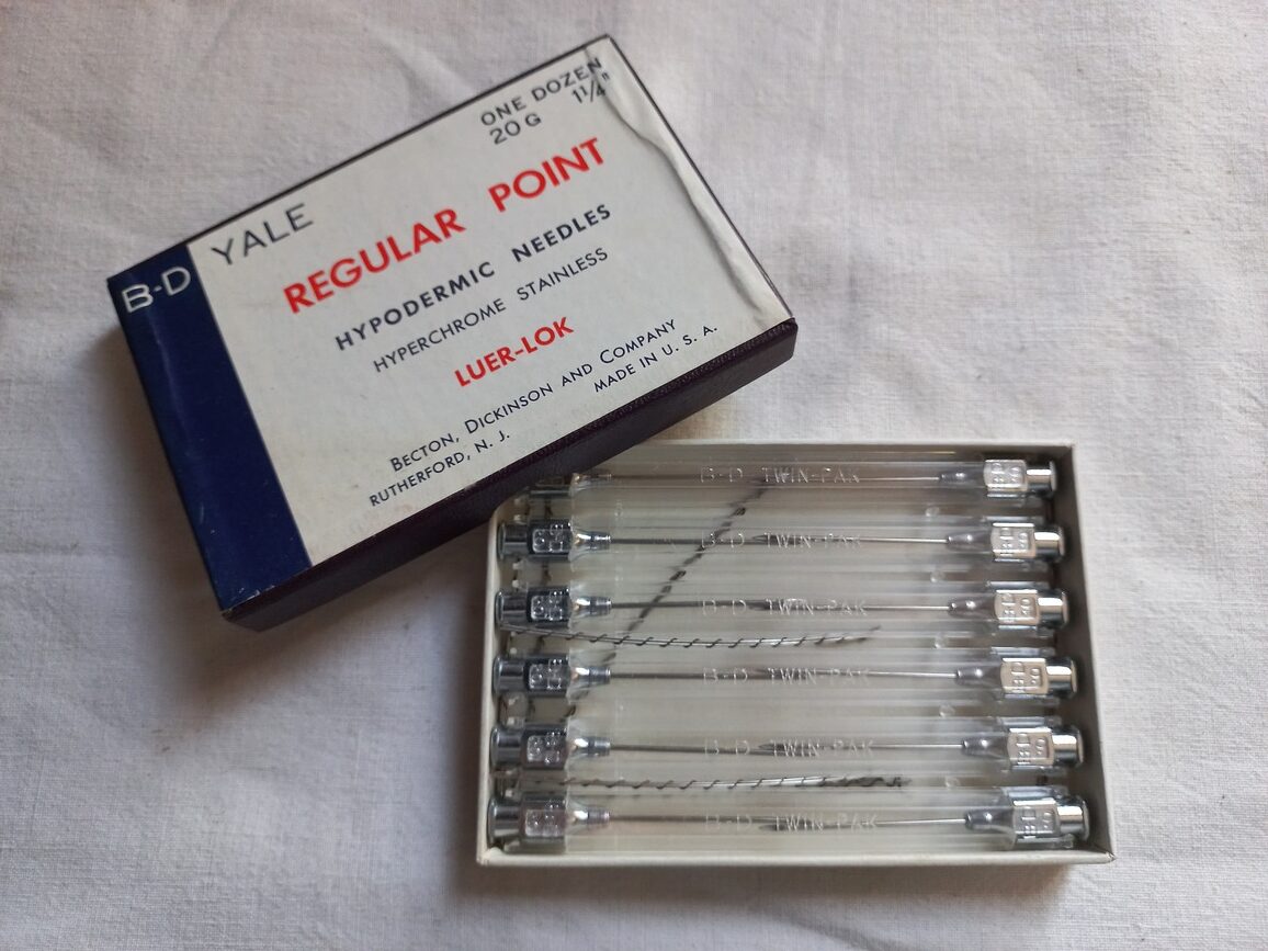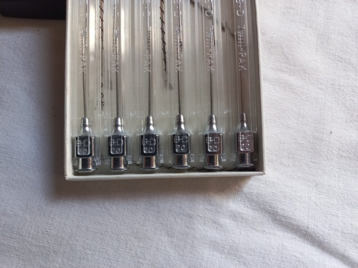 Boite de d’aiguilles pour seringue (size 1-1/4) d’origine en TBE. Elles se montent sur les seringues réglementaires US vendues à part (voir photo).