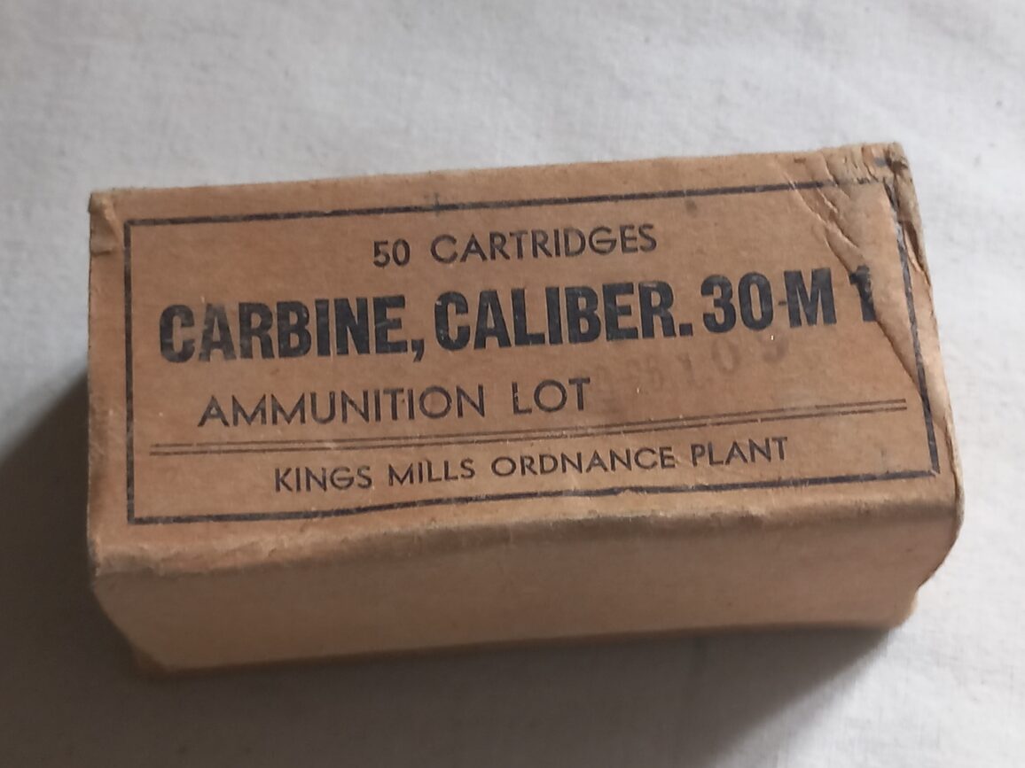 Boite en carton vide prévue pour contenir de 50 munitions de calibre .30 M1. Fabrication WWII par KINGS MILLS ORDNANCE PLANT.