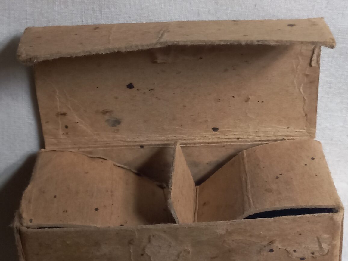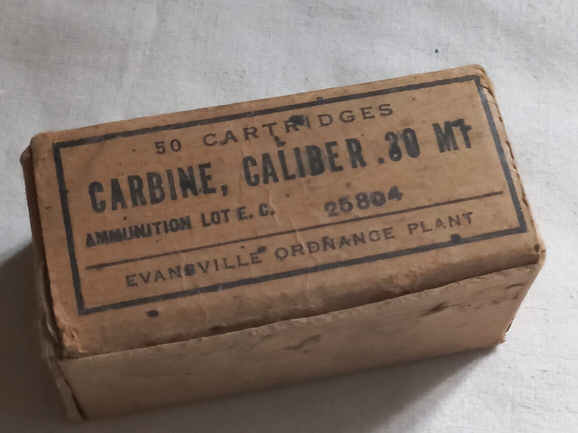 Boite en carton vide prévue pour contenir de 50 munitions de calibre .30 M1. Fabrication WWII par EVANSVILLE ORDNANCE PLANT.
