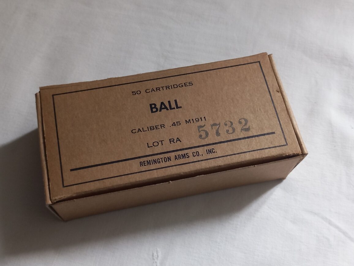 Boite en carton vide prévue pour contenir de 50 munitions de calibre .45. Fabrication WWII lot 5732 REMINGTON.