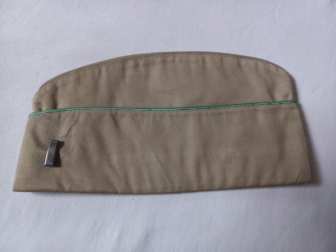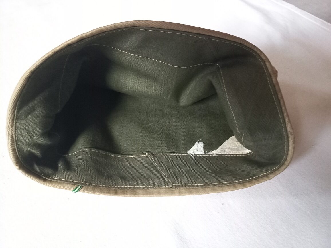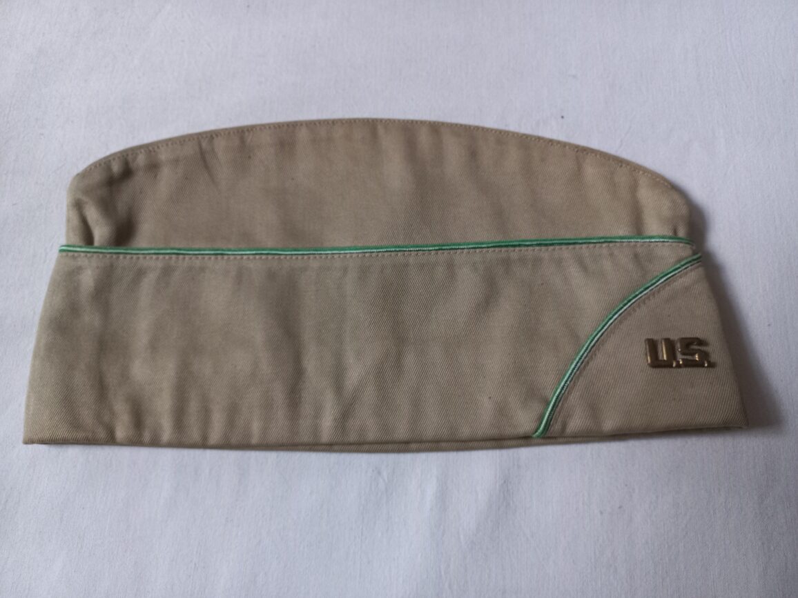 Calot en toile kaki clair en TBE, taille 57/58 fr avec doublure en toile HBT. Ce type de coiffure a été porté en Normandie comme l’atteste cette photo de 1944.