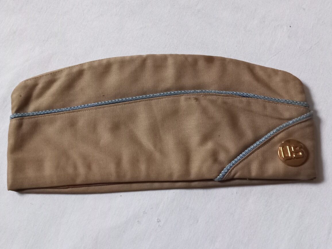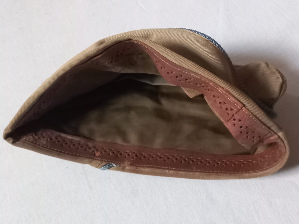 Calot en toile kaki clair en TBE de confection tailleur, taille 57/58 fr avec matricule D-5923 inscrit à l’intérieur. Ce type de coiffure a été porté en Normandie comme l’atteste cette photo de 1944.