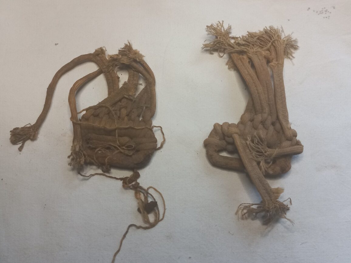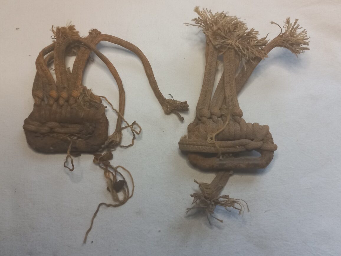 Boucles de fouille de harnais d’un parachute T5 retrouvées avec les restes de suspentes coupées. Pièce 100% D-DAY de la drop zone C de la 101°AIRBORNE à Sainte Marie du Mont.