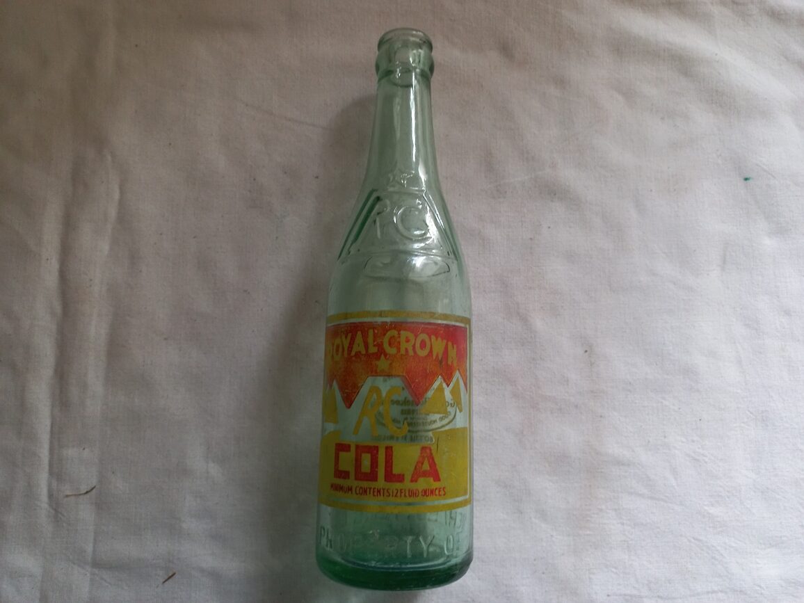 Très peu courante bouteille de ROYAL CROWN COLA (en relief) en TBE marquée « copyright 1936 ».