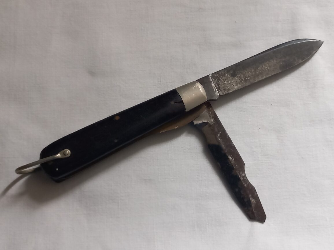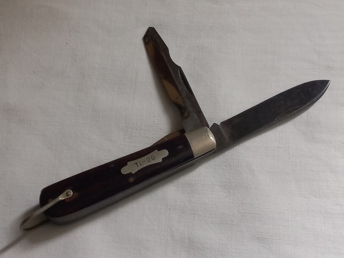 Couteau du 1er modèle en TBE marqué « UTICA ». Le sigle TL-29 est gravé coté gauche sur une plaquette métallique. Utilisé dans les trousses de monteur de ligne du signal corps ou les équipes de démolition du génie US.