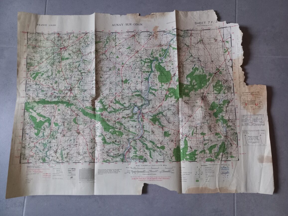 Carte originale d’AUNAY sur ODON datée 1943 (1/50000′) de fabrication US. Retrouvée à ST LO.