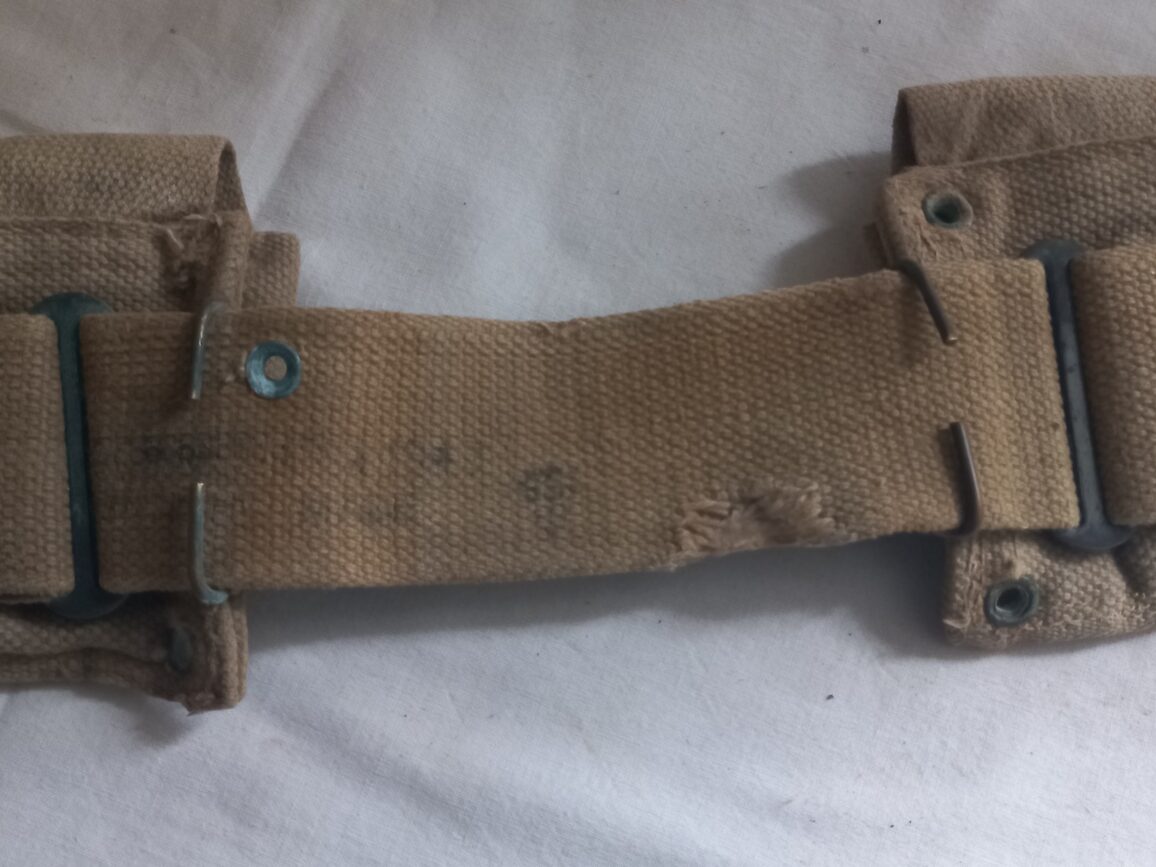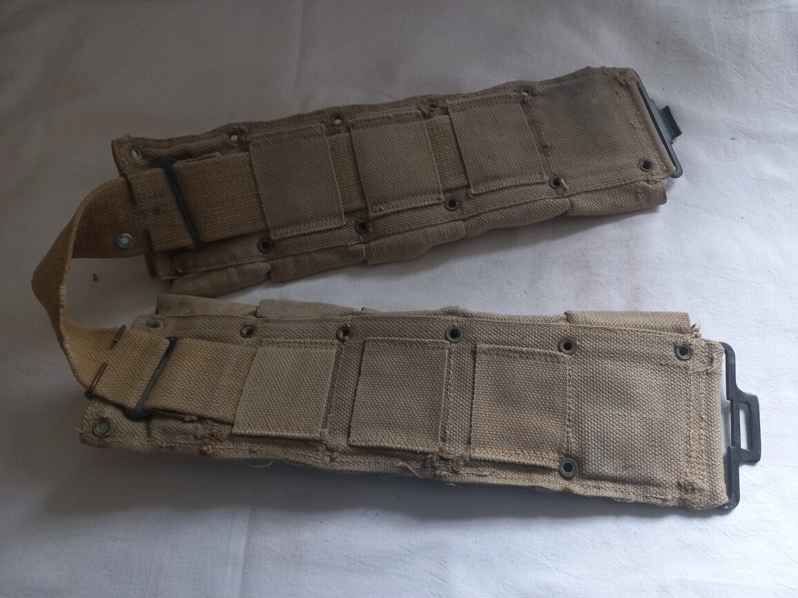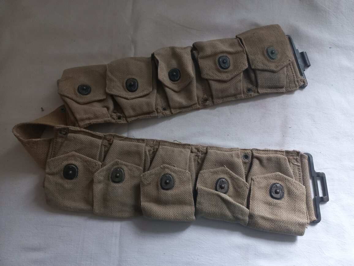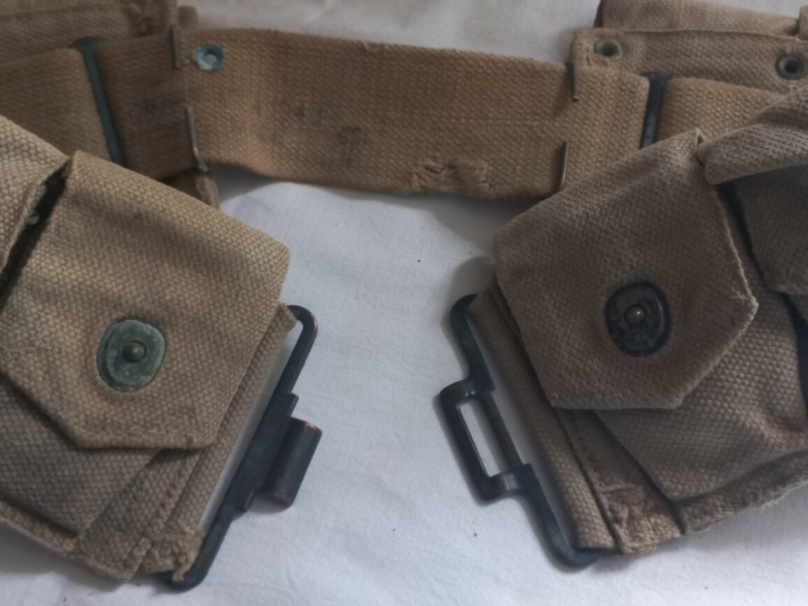Ceinturon « british made » à 10 compartiments en TBE pour fusil M1 ou M1903 couleur OD3 daté 1943. Quelques œillets manquants à signaler suite à son utilisation (pièce terrain).