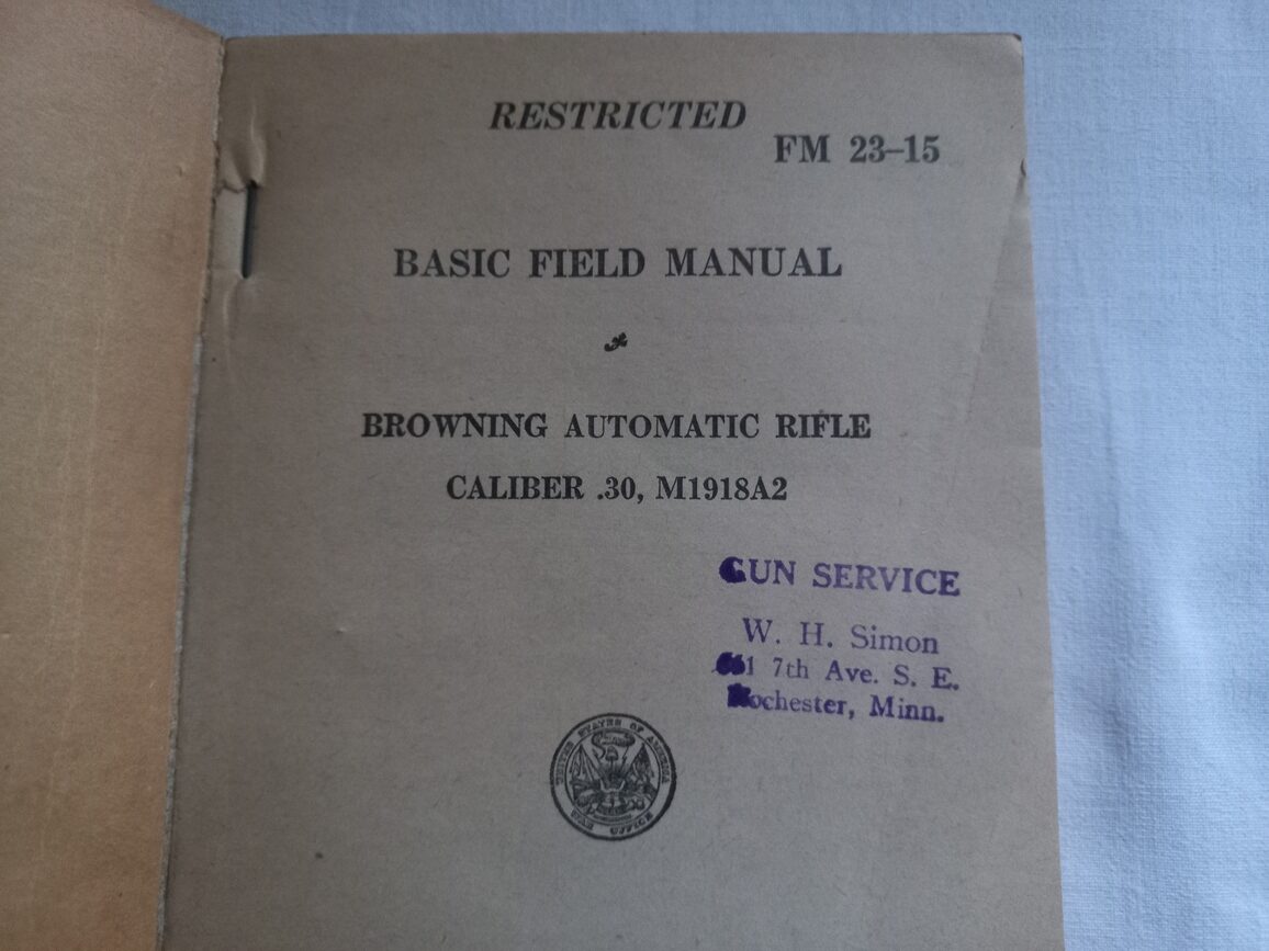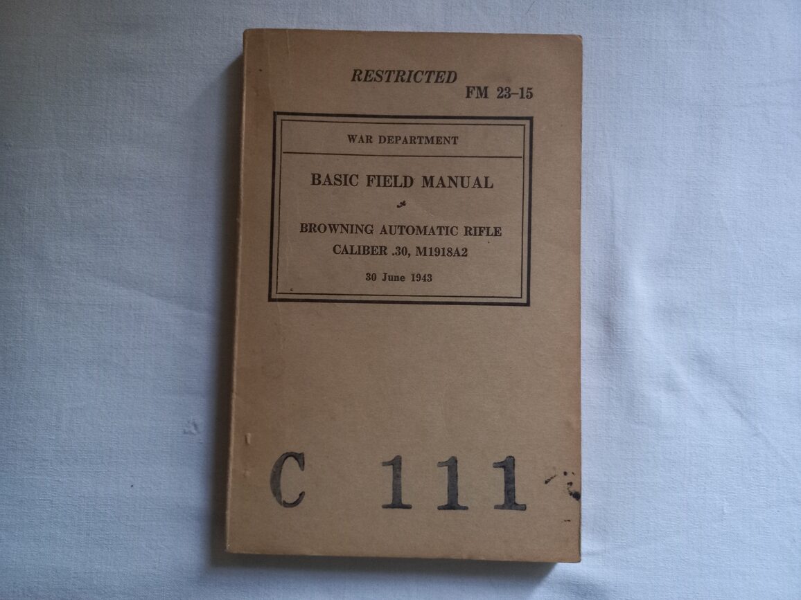 Rare manuel complet de 284 pages en TBE sur l’utilisation du FM BAR M1918A2. Ouvrage matriculé C 111 complet avec reliure parfaite.