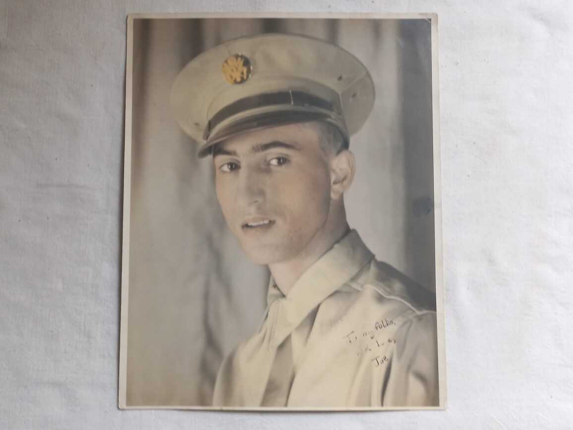 Grande photo originale de studio d’un GI de l’US ARMY en format 20 x 25 cm dédicacée.
