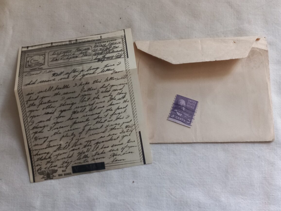 Lettre V-MAIL SERVICE datée 1944. C’est une lettre microfilmée et imprimée par l’ US ARMY afin de diminuer le volume du courrier et faciliter son transport durant le conflit. Celle ci a été expédiée par le soldat FORSEZE à son épouse à Lynn.