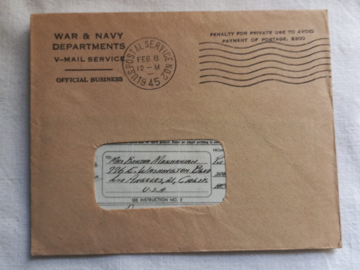 Lettre V-MAIL SERVICE datée 1945. C’est une lettre microfilmée et imprimée par l’ US ARMY afin de diminuer le volume du courrier et faciliter son transport durant le conflit. Celle ci a été expédiée par le soldat MAKHANIAN à son épouse à Los Angeles.