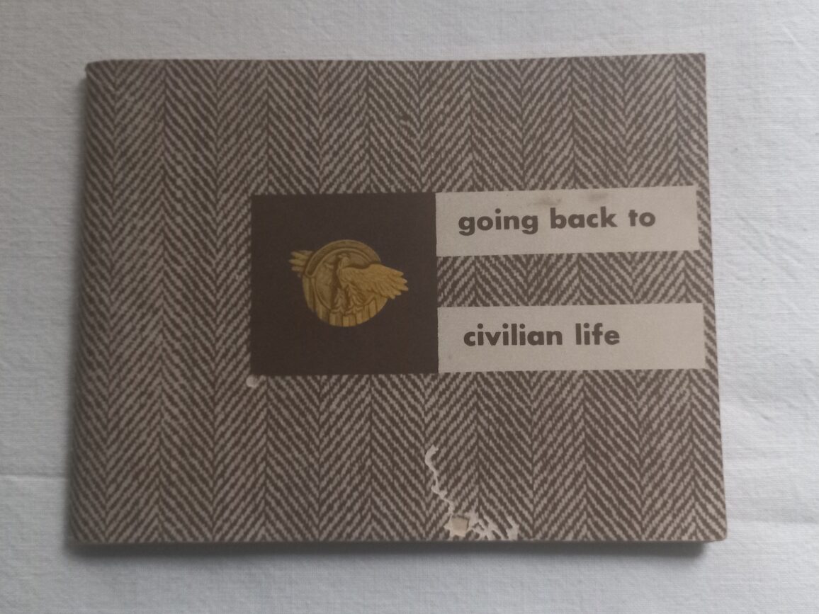 Livret de 88 pages en BE distribué à tous les GI démobilisés. Ce guide donne une foule de renseignements pour leur retour à la vie civile (assurance, travail, soins..). Reliure à restaurer.