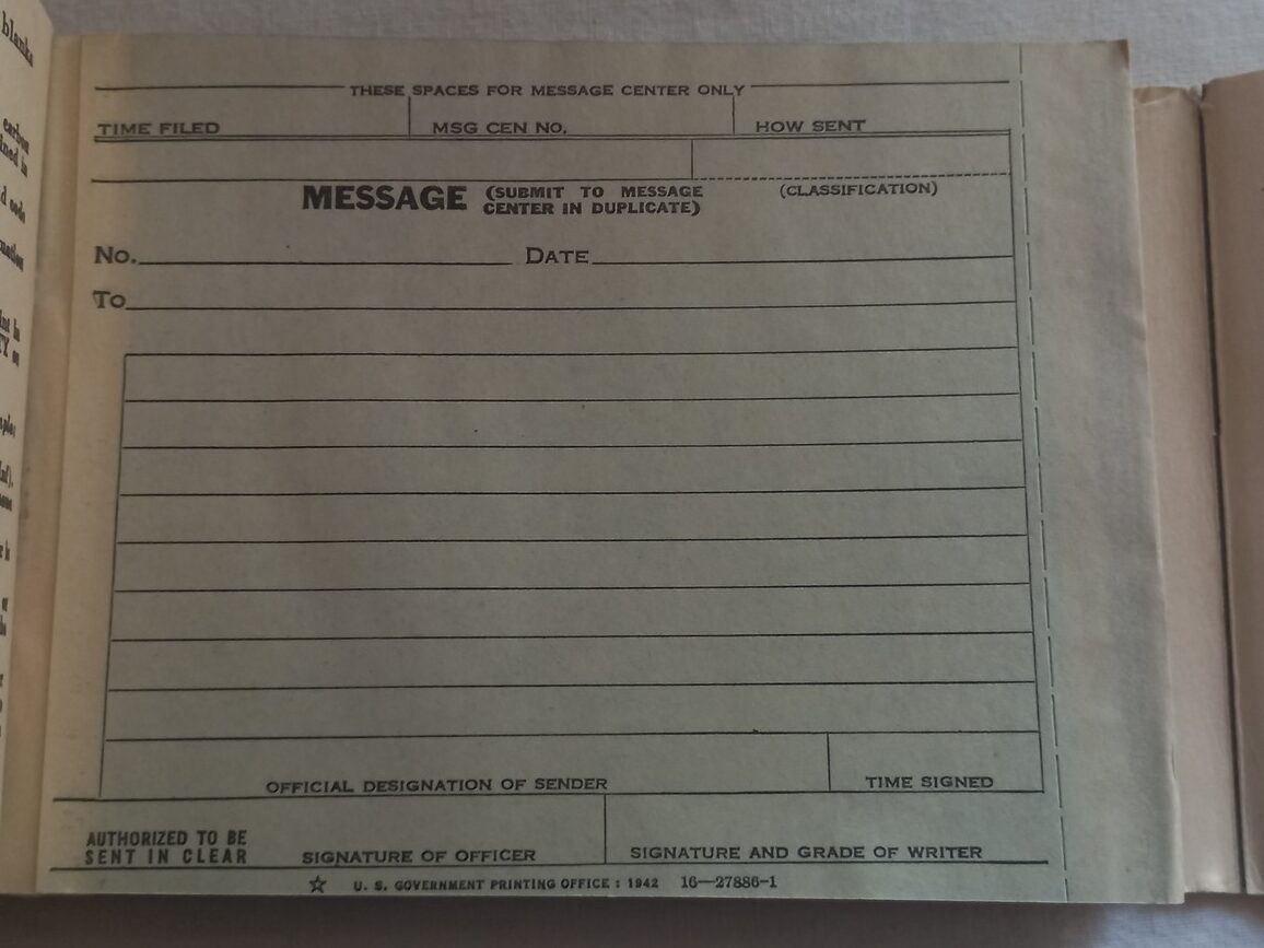 Carnet de message du SIGNAL CORPS en TBE utilisé tout au long du conflit. Modèle original daté 1942.