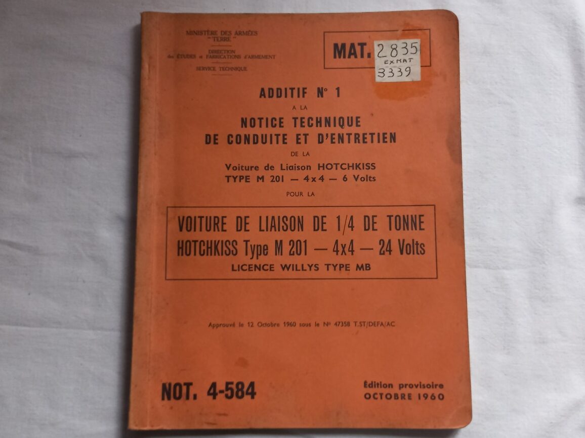 MAT 2835 daté 1960 de 97 pages en TBE sur la conduite et l’entretien de la JEEP M201 en 6 et 24 volts.