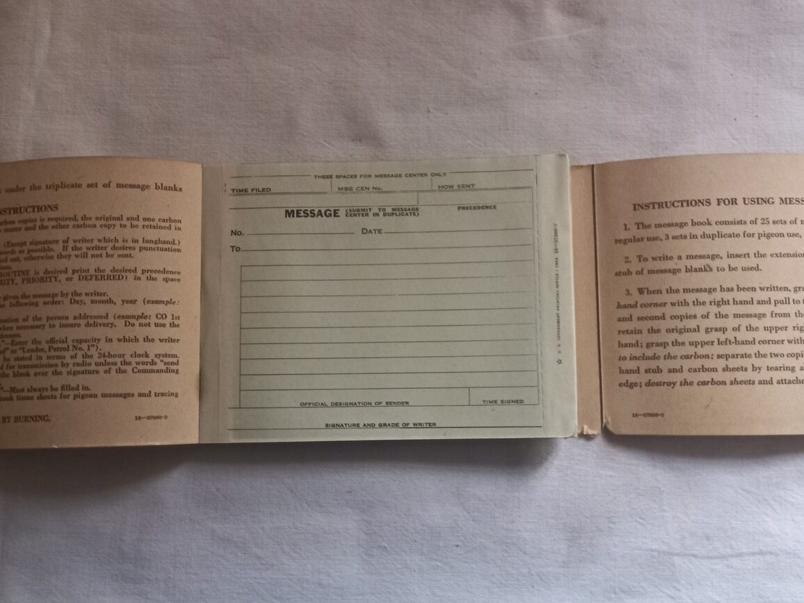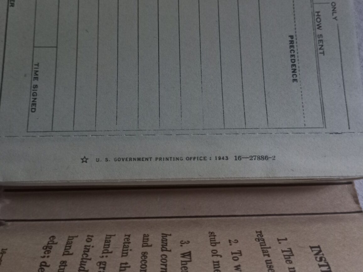 Carnet de message du SIGNAL CORPS en TBE utilisé tout au long du conflit. Modèle original daté 1943.