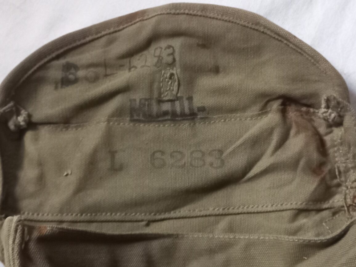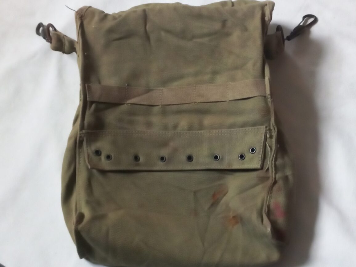 Belle musette d’infirmier de couleur OD3 en TBE avec ses 2 crochets en laiton matriculée L-6283 et MD-111 sous le rabat.