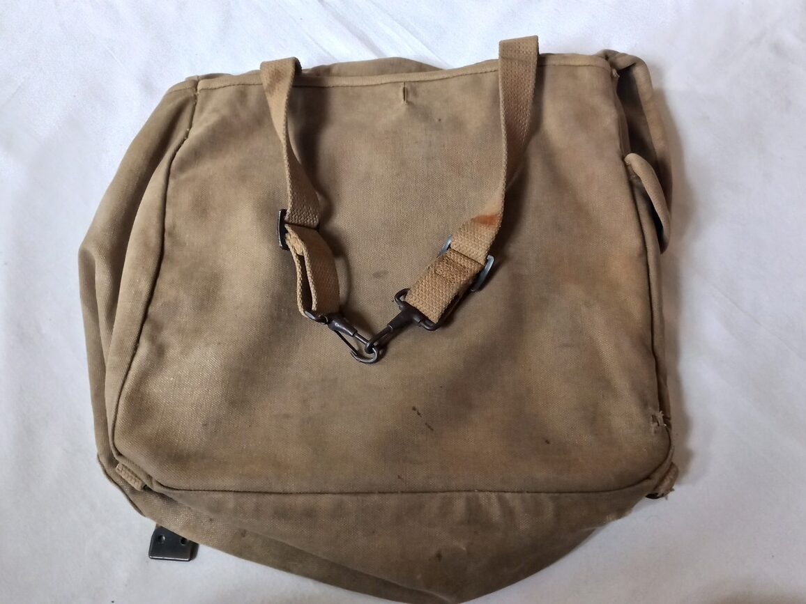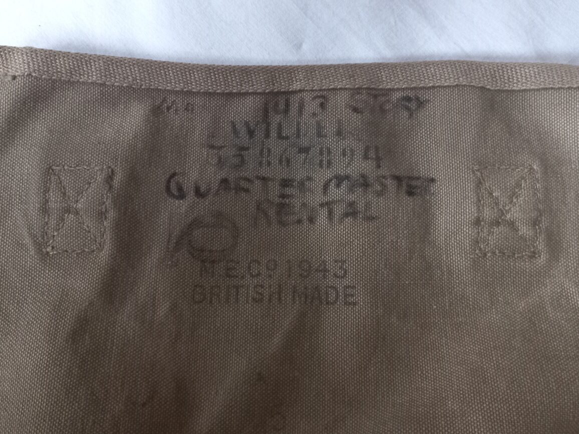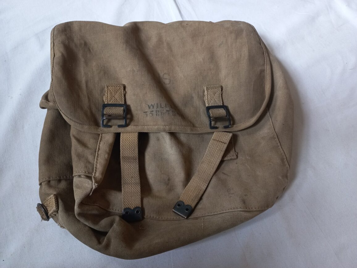 Musette M36 datée 1943 « british made » en TBE de couleur OD3. Pièce  matriculée 35867894 ayant appartenue au soldat WILDER MARION engagé en 1943.