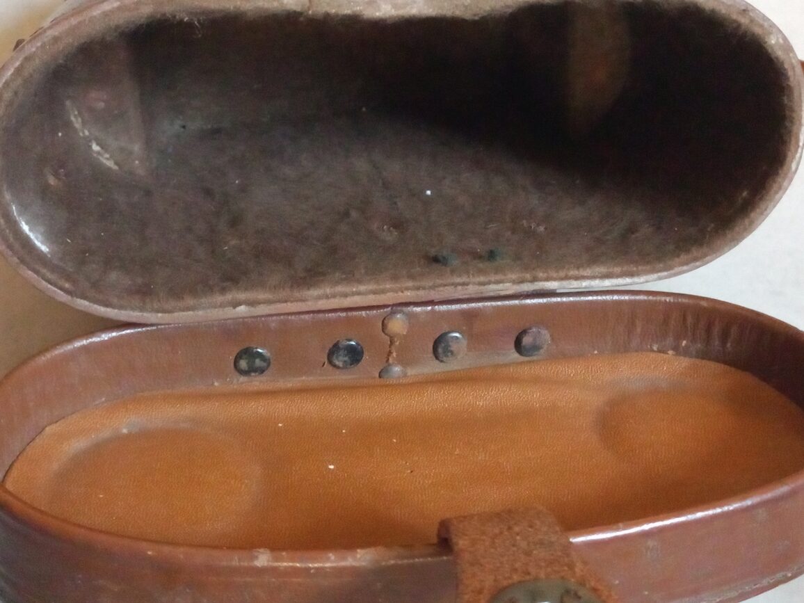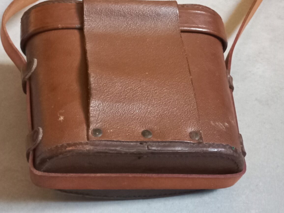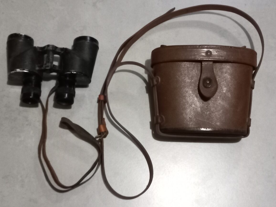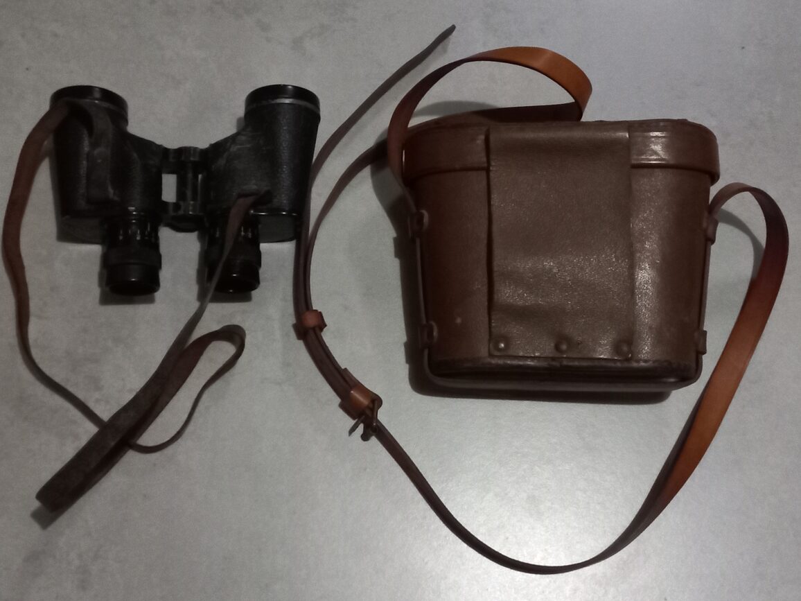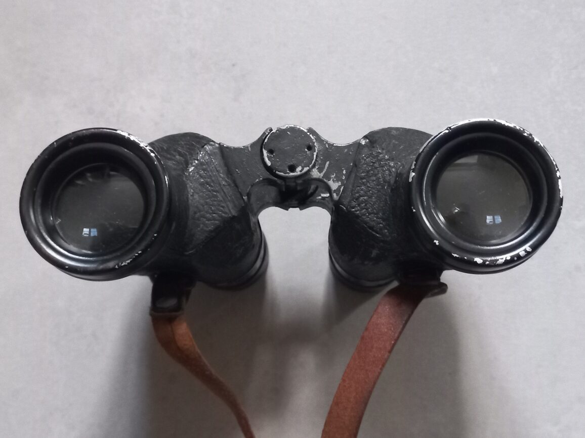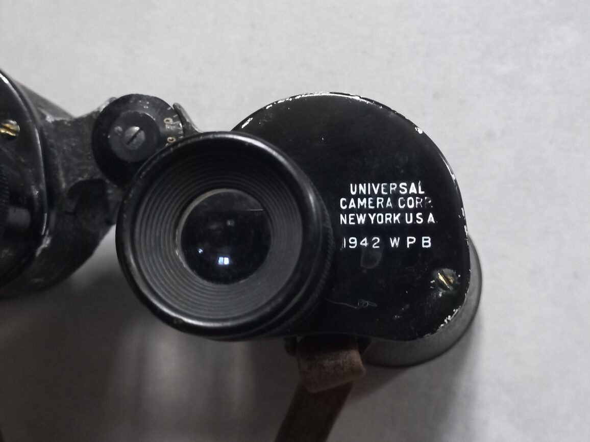 Paire de jumelles datées 1942 de fabrication UNIVERSAL CAMERA CORP. avec son étui cuir M17. Ensemble d’occasion en TBE avec impuretés dans les 2 optiques (modèle avec lignes stadimétriques) et lanières cuir à graisser.