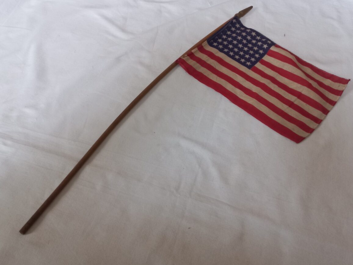 Petit drapeau US en TBE format 16×26 imprimé sur coton. Le mat en bois mesure 65cm.