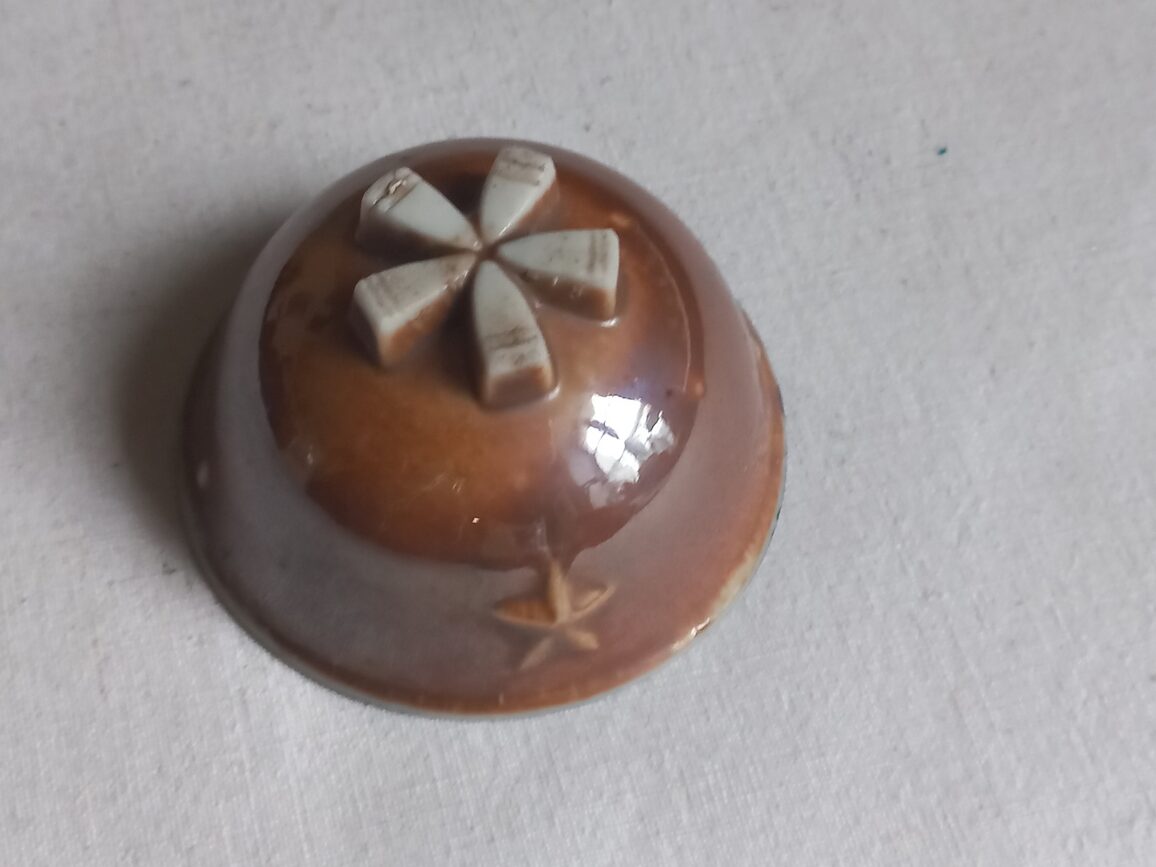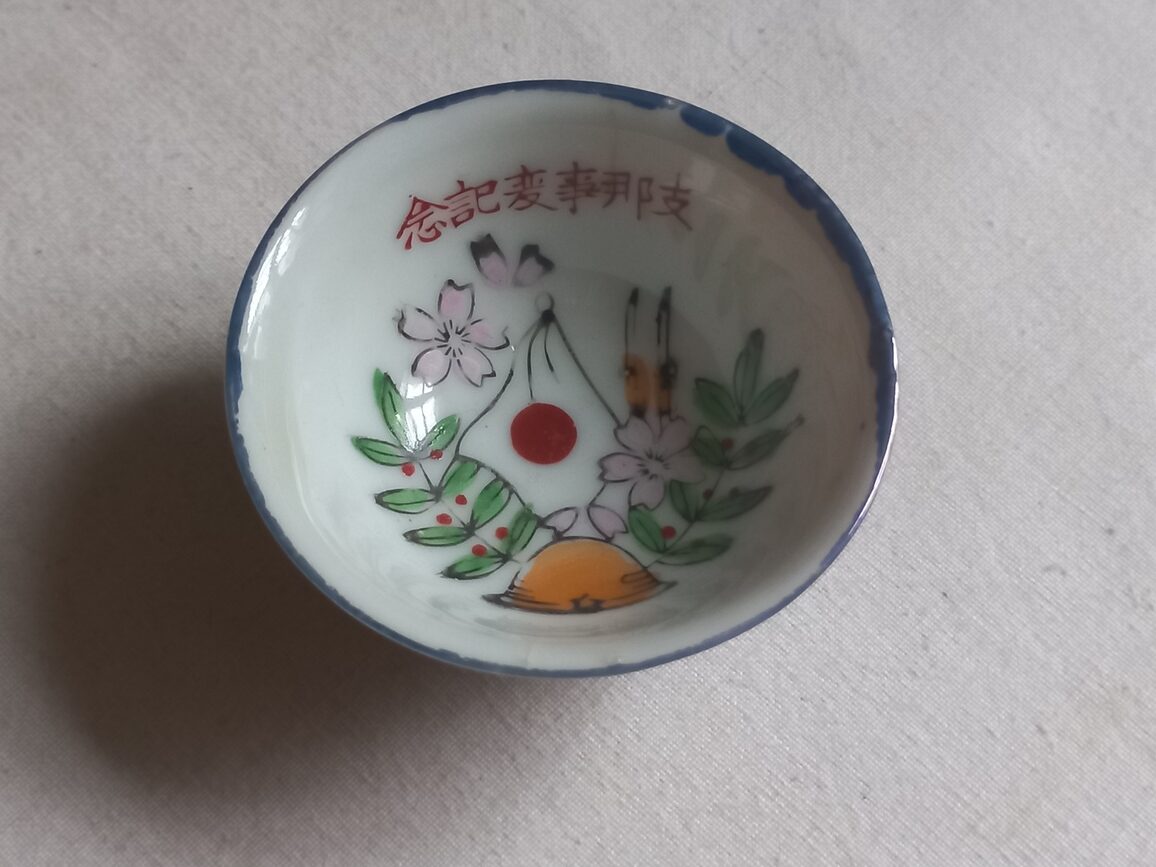 Petite coupe à saké représentant le casque japonais et rapportée par un soldat américain lors de sa campagne dans le pacifique. Diamètre 5.5 cm.