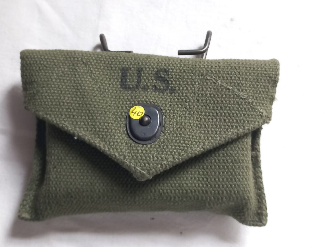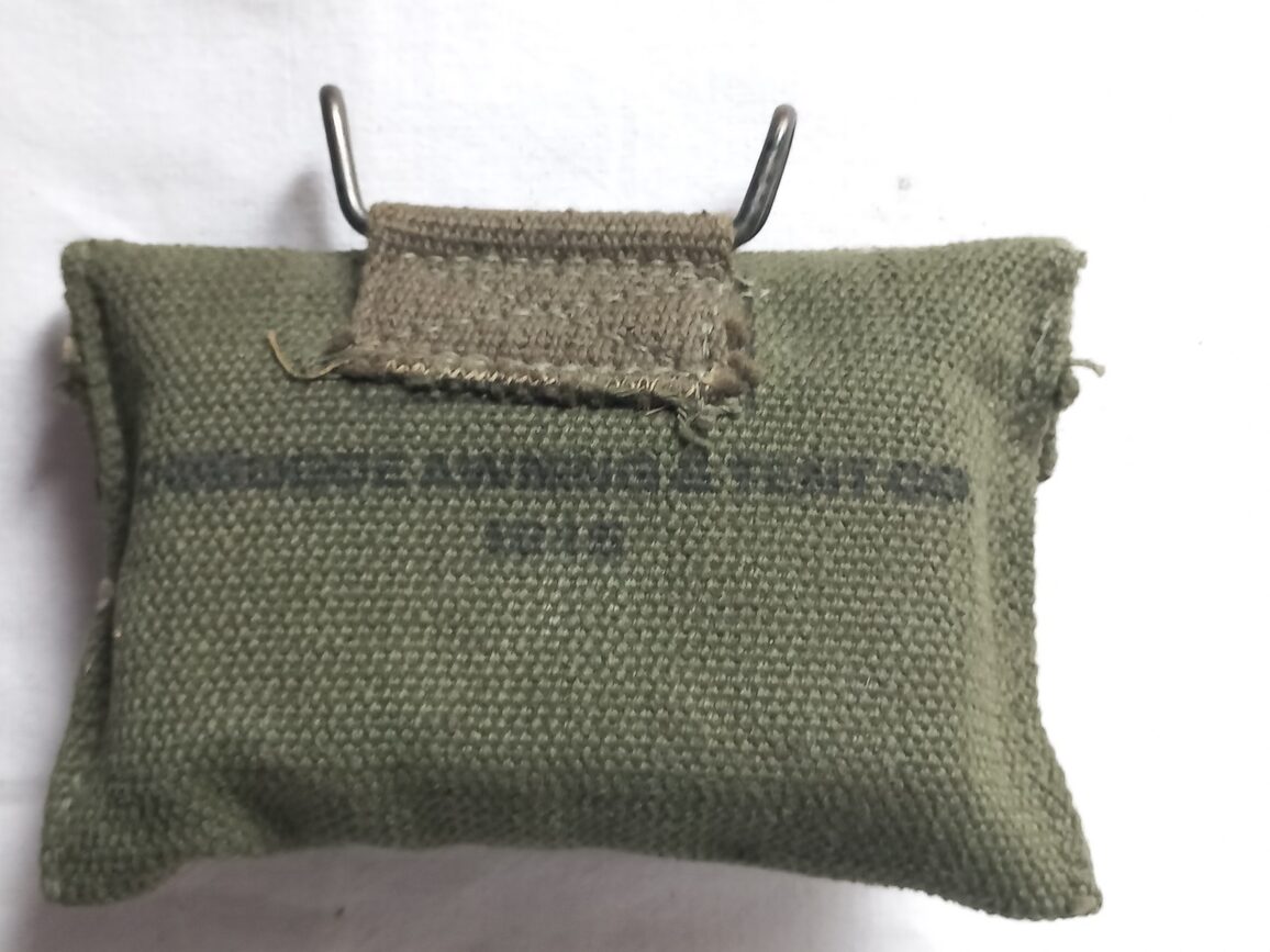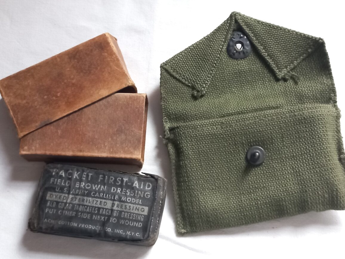 Pochette à pansement OD7 datée 1945 en TBE vendue avec un pansement en emballage papier.
