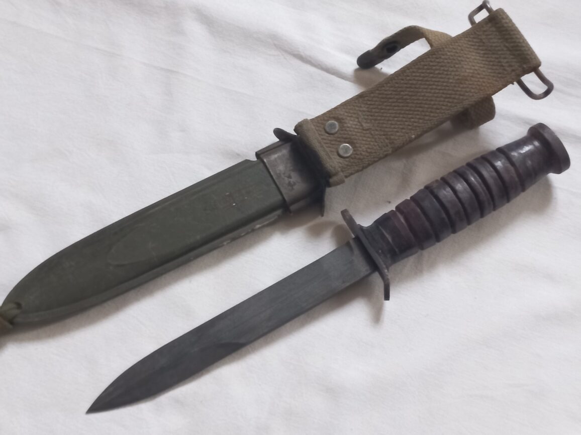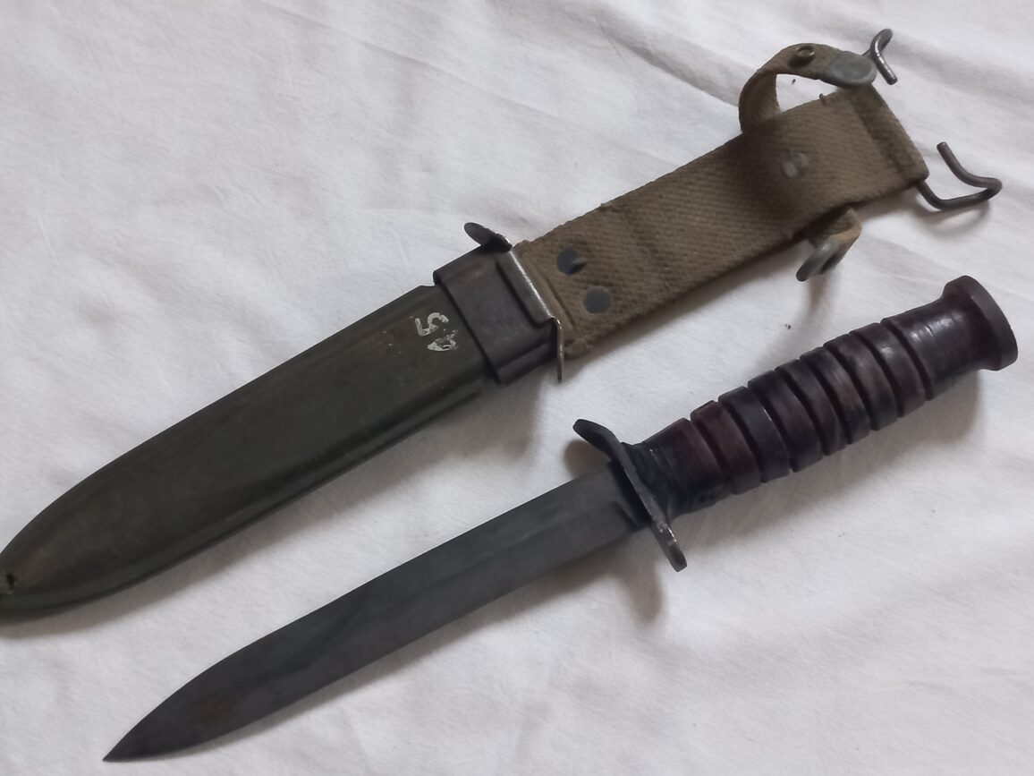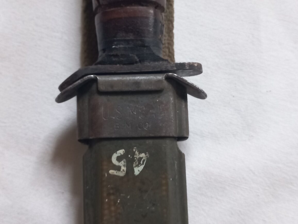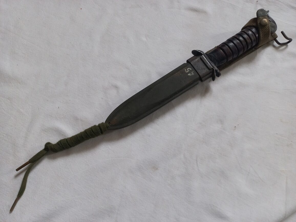 Poignard US M3 UTICA marquage garde avec fourreau US M8A1 BM CO en plastique en TBE non repeint. Marquage BN5/0 sous l’oreille gauche typique de la fabrication de guerre.