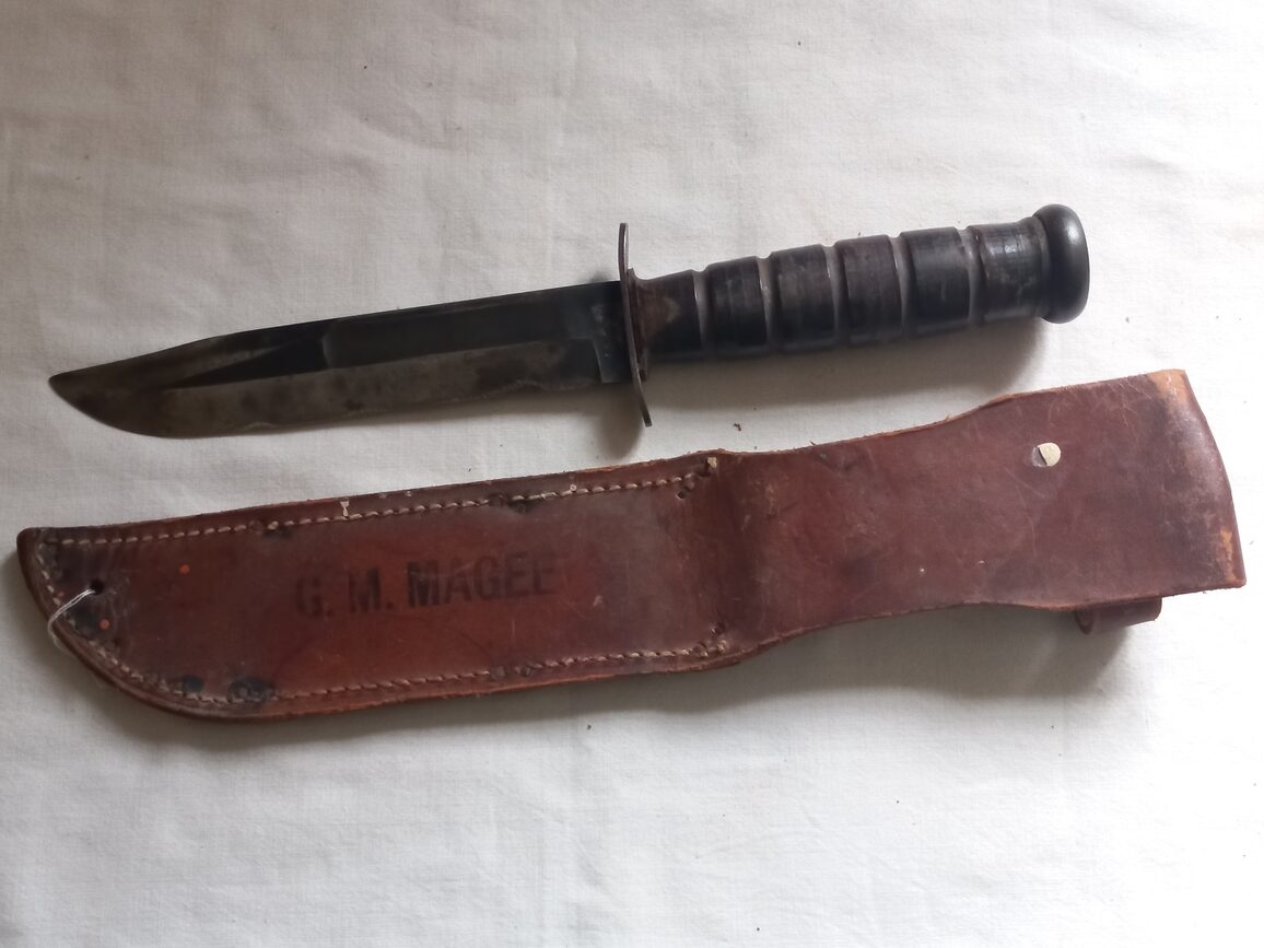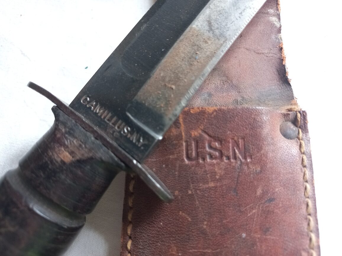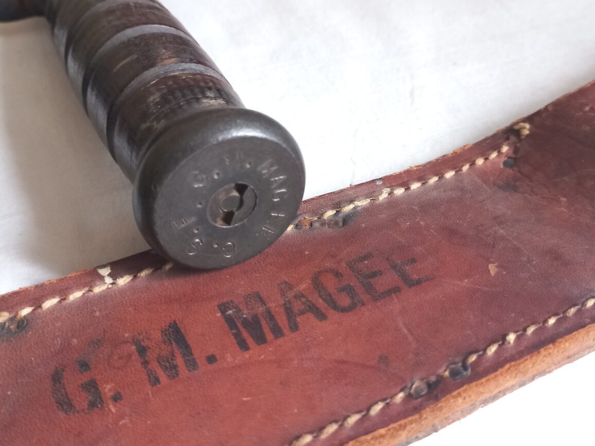 Poignard USN MK2 fabrication CAMILLUS en TBE avec pommeau et fourreau cuir marqués G.M.MAGEE.