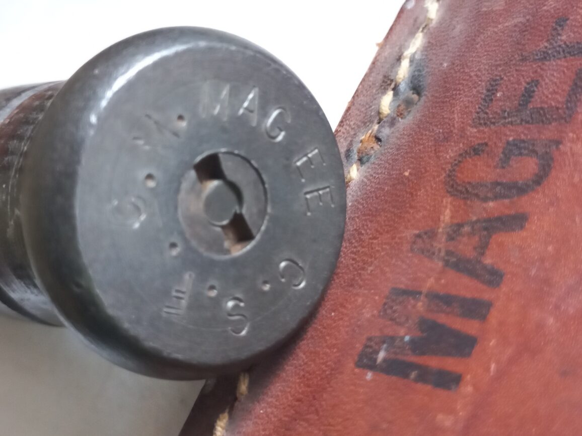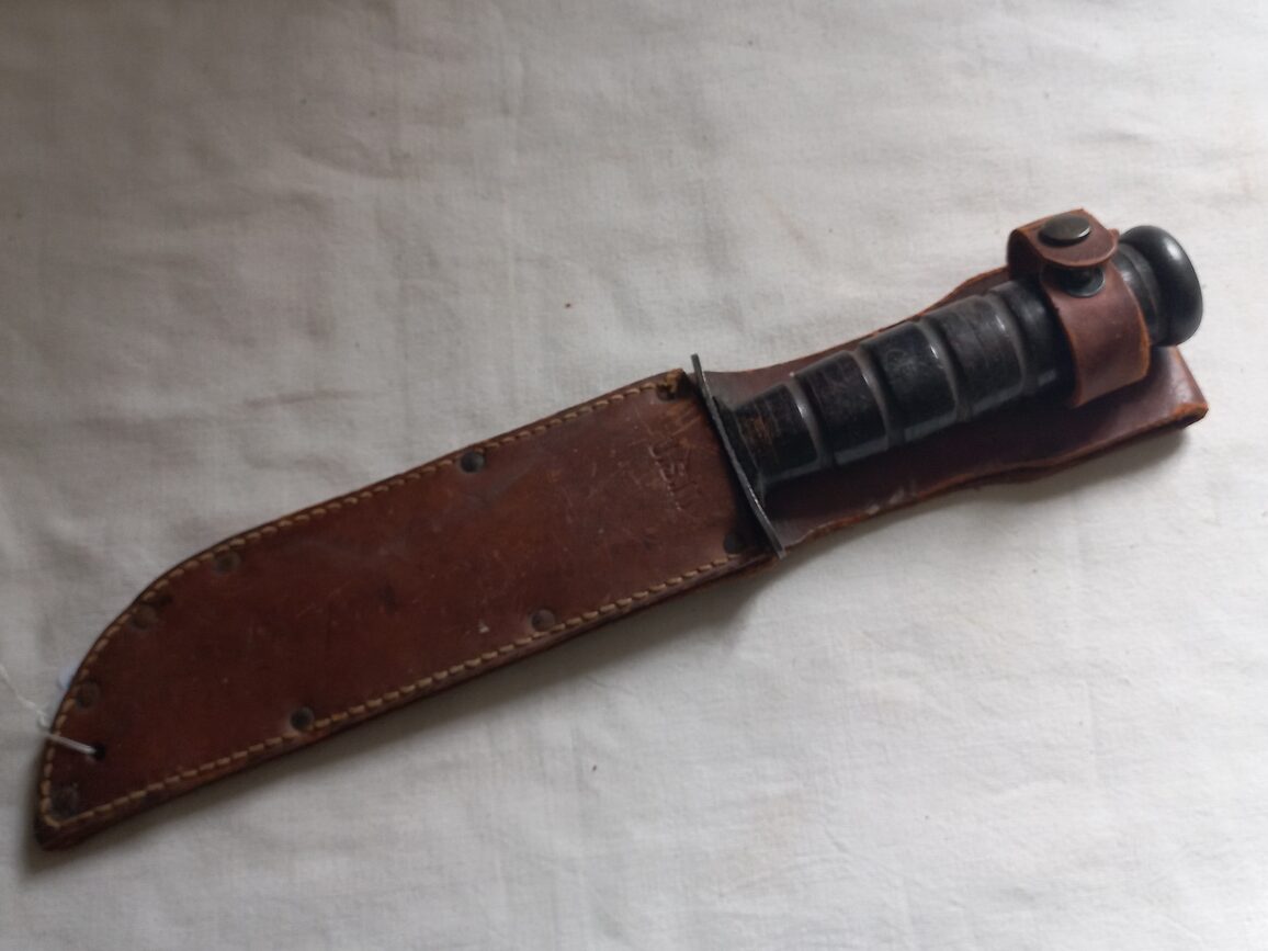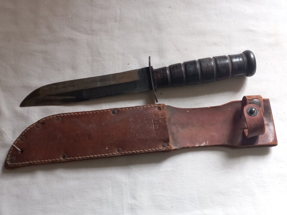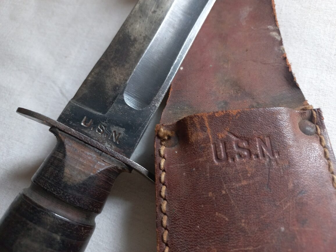Poignard USN MK2 fabrication CAMILLUS en TBE avec pommeau et fourreau cuir marqués G.M.MAGEE.