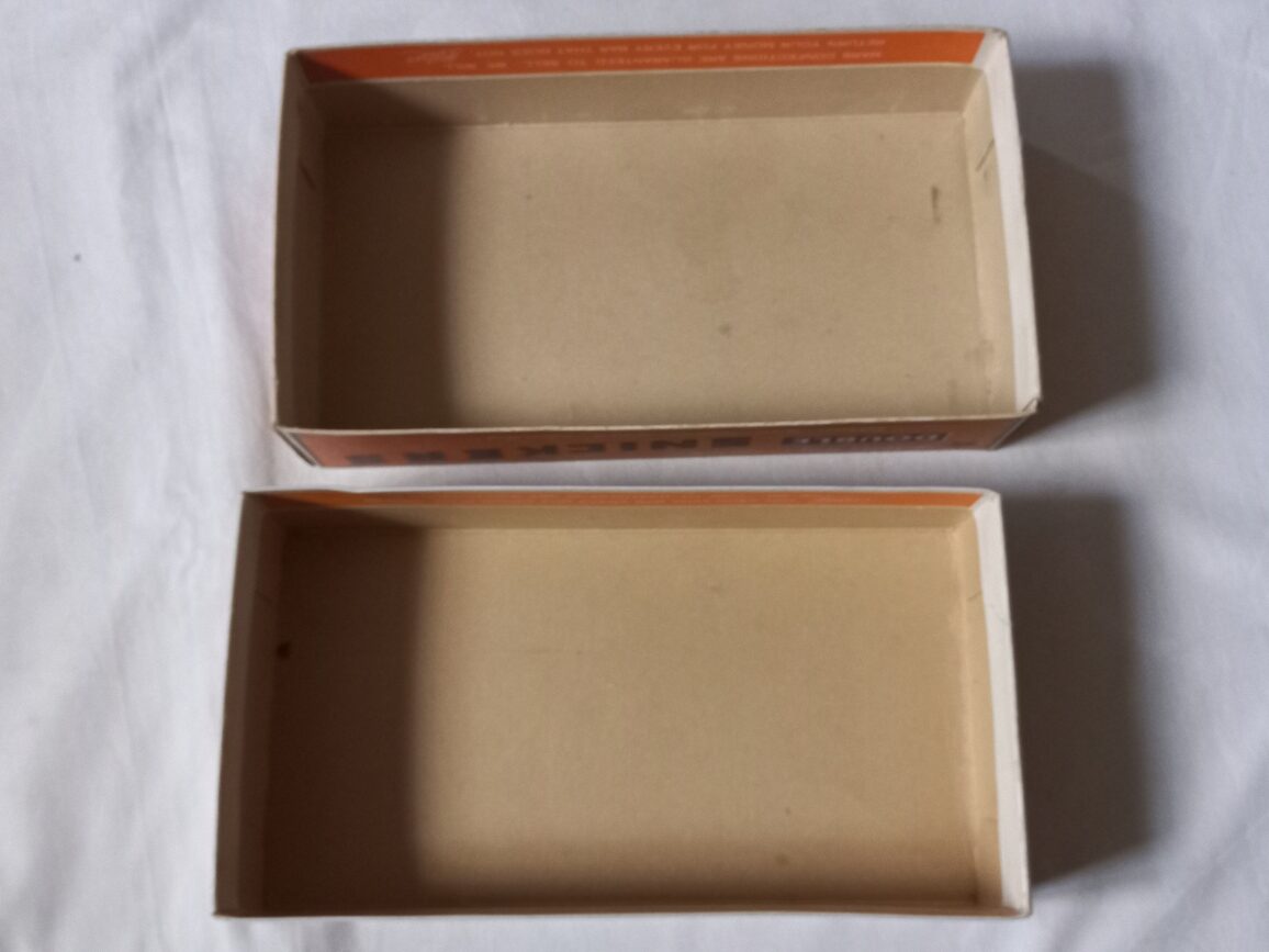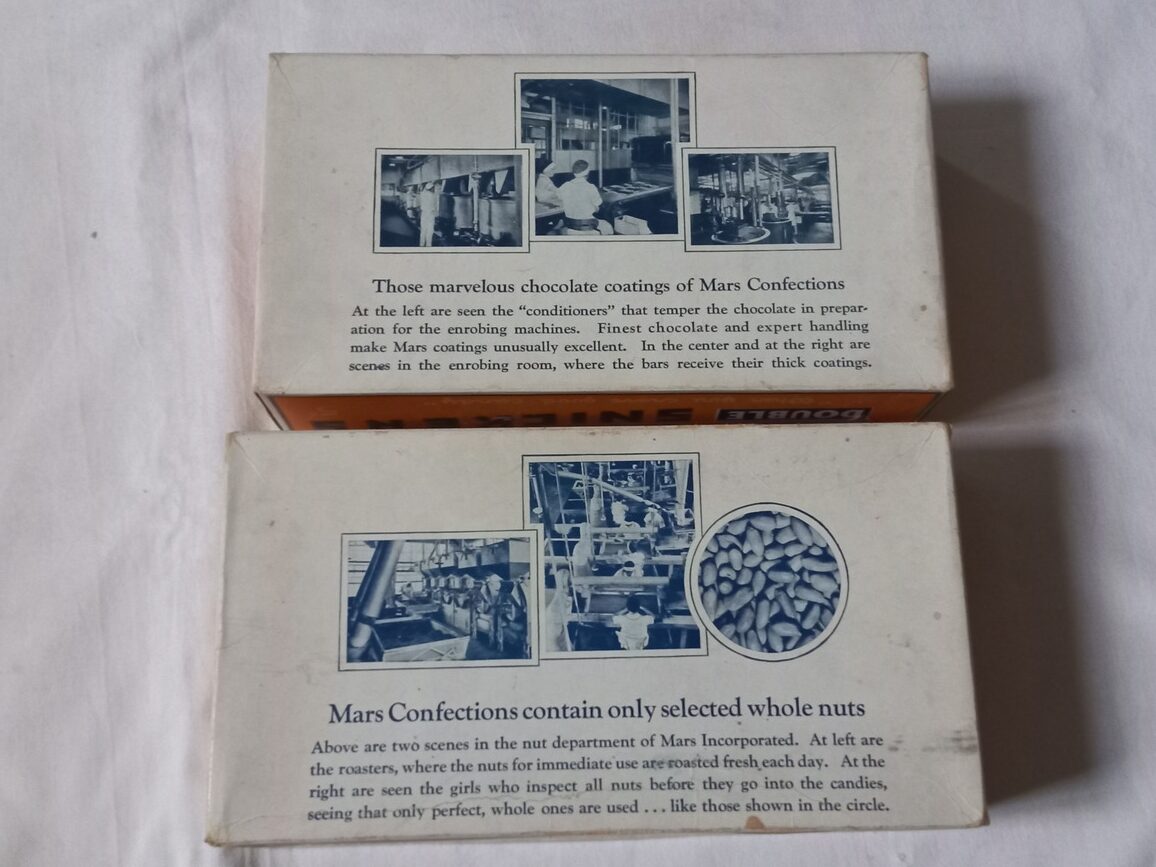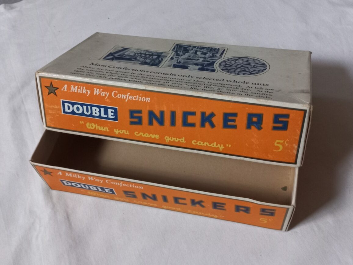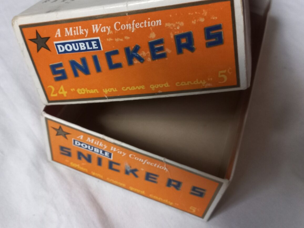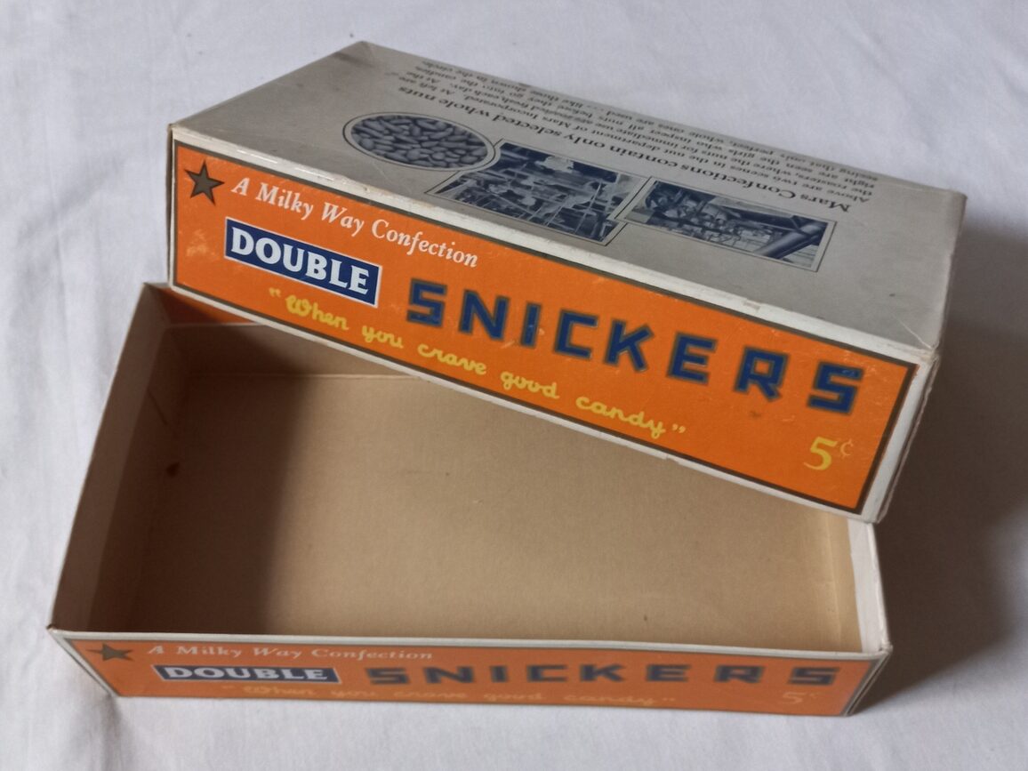 Rare boite en carton de chocolats SNICKERS proposée à la troupe dans les PX. Pièce en TBE dans son jus avec quelques petites taches et déchirures sans gravité.