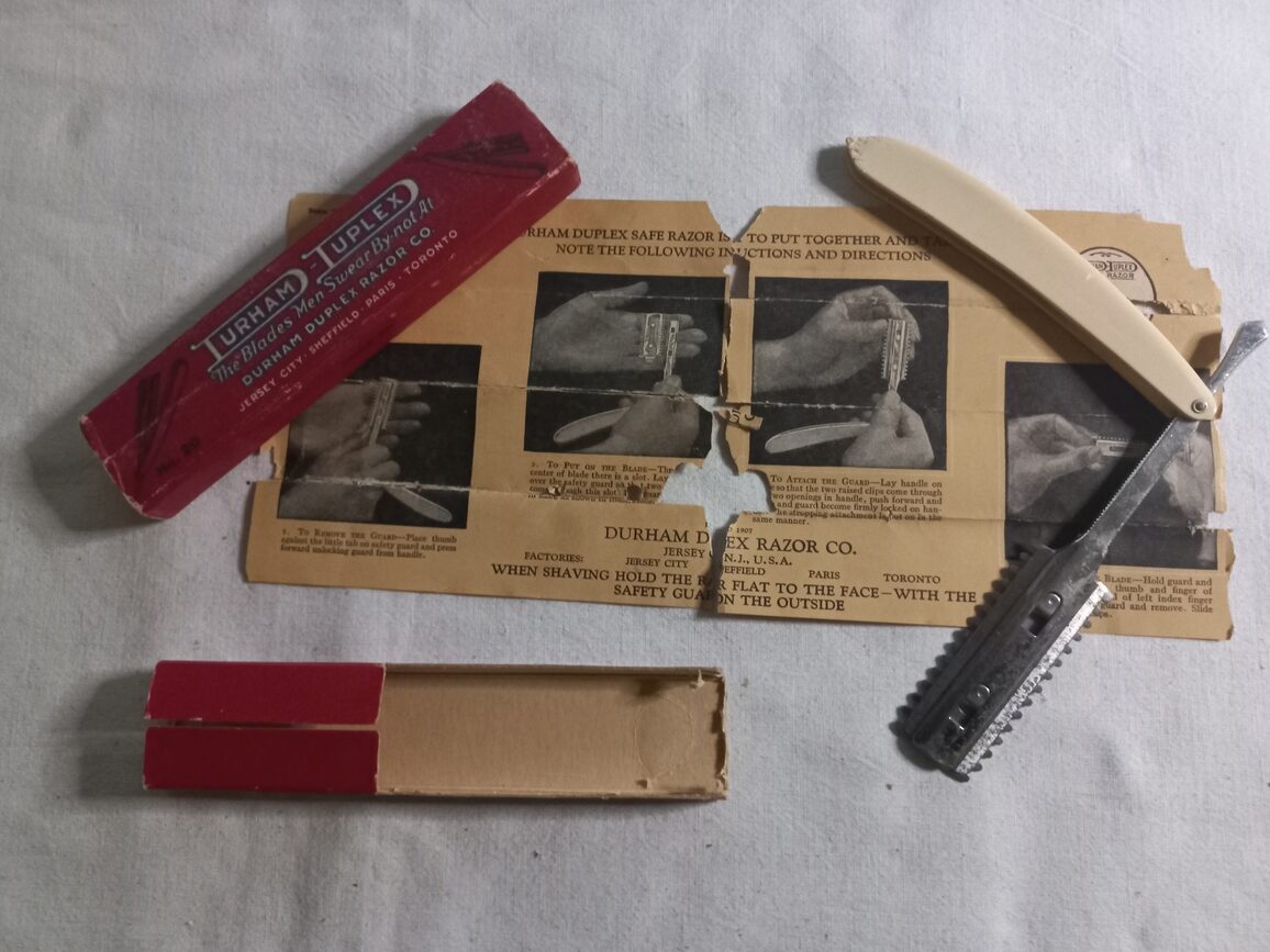 Rasoir DURHAM/DUPLEX en boîte carton dans sa boite carton d’origine avec sa notice. Le rasoir est en parfait état mais la boite et la notice sont très usagées.