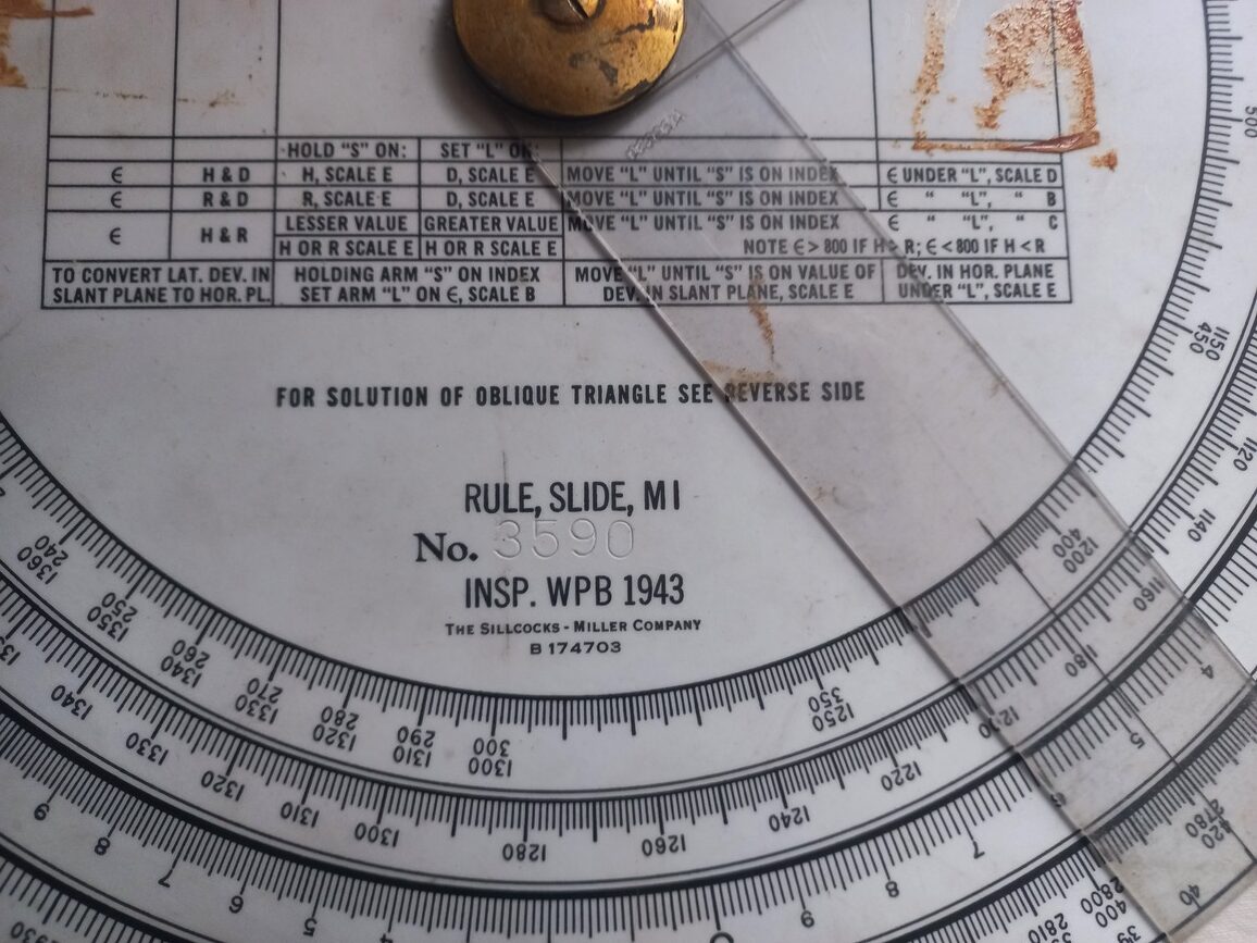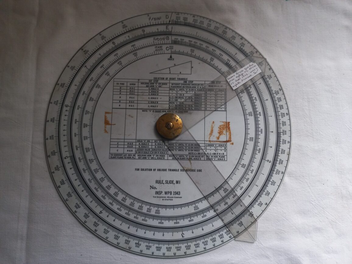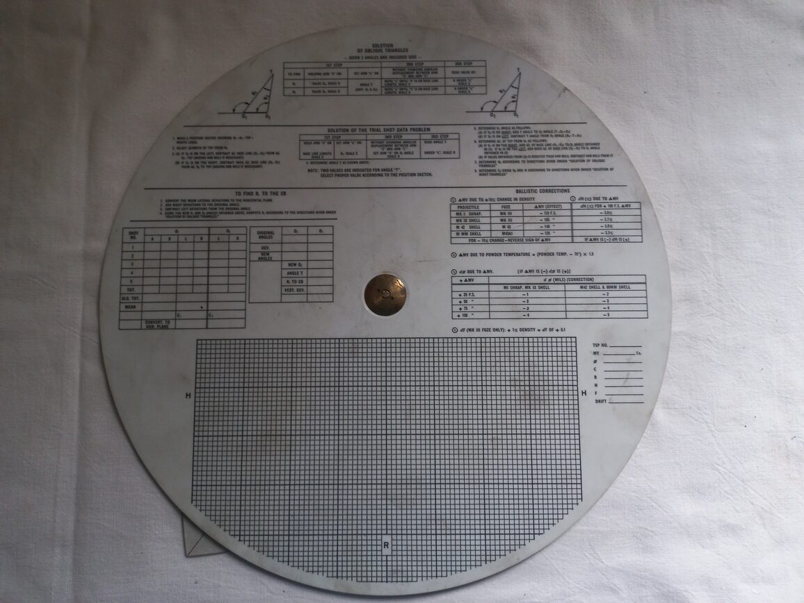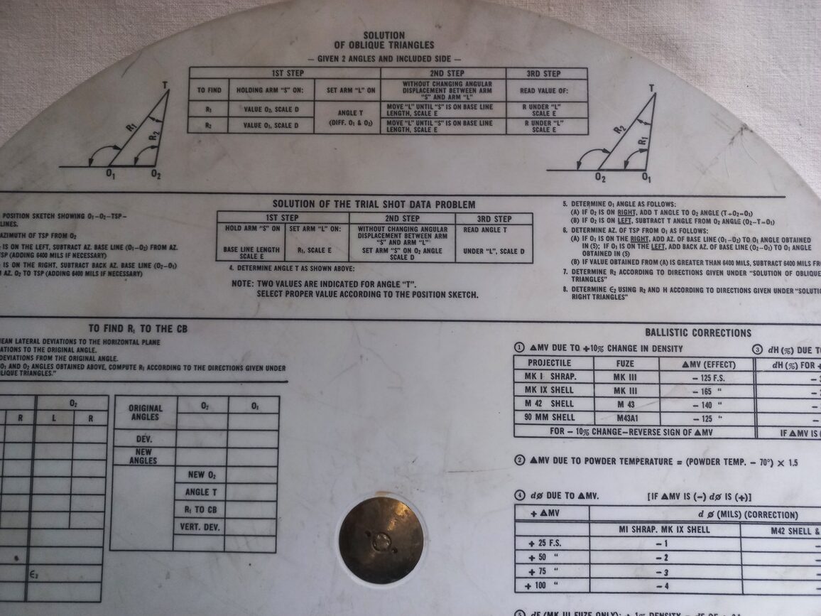 Règle de calcul d’artillerie daté 1943 en TBE. Cet ustensile équipait tous les engins blindés US pouvant effectuer des tirs courbes (AMM8, SHERMAN, STUART…).