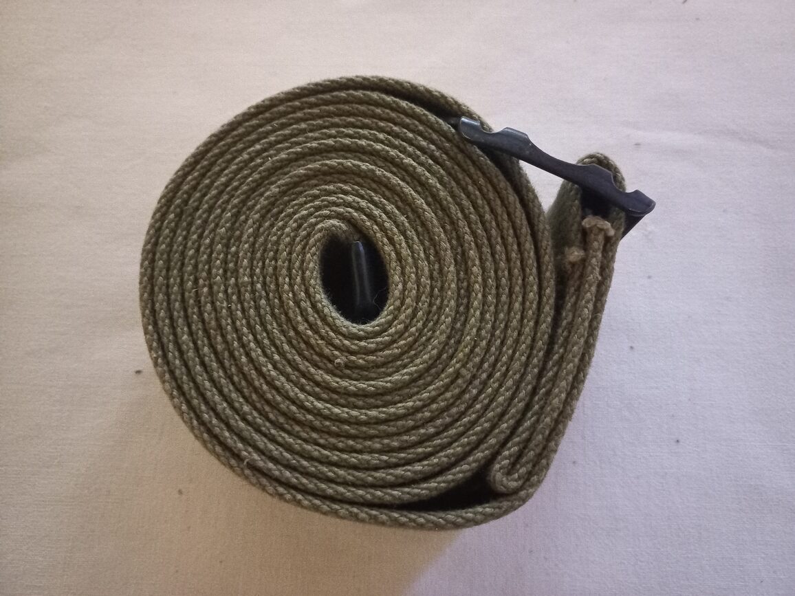 Sangle originale de Bedding Roll M35 couleur OD3 en TTBE. Modèle à boucle emboutie (L230 cm). Une seule disponible.
