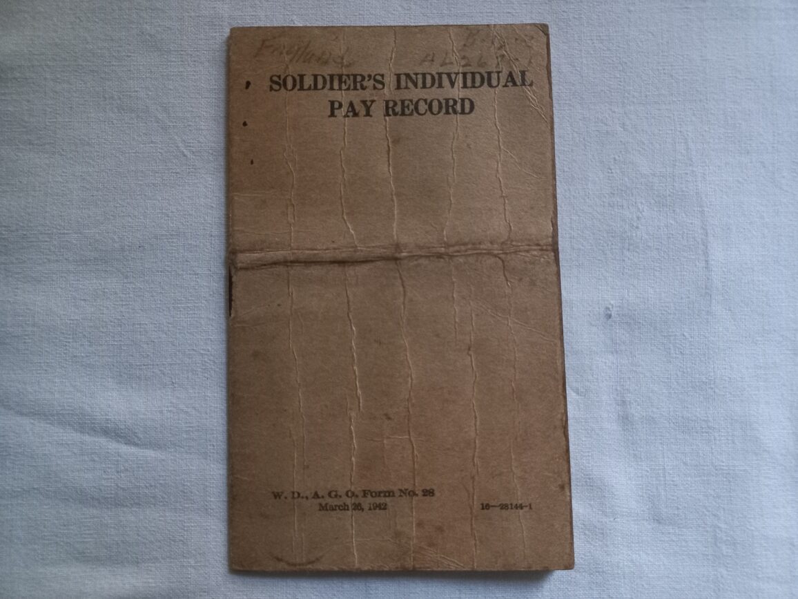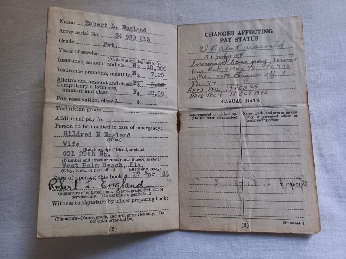Soldier individual pay record de 1944 nominatif en TBE ayant appartenu au soldat ROBERT ENGLAND matricule 34980913 engagé le 27 avril 1944.