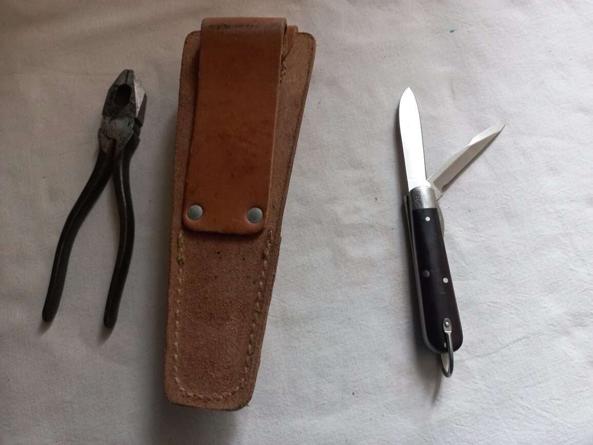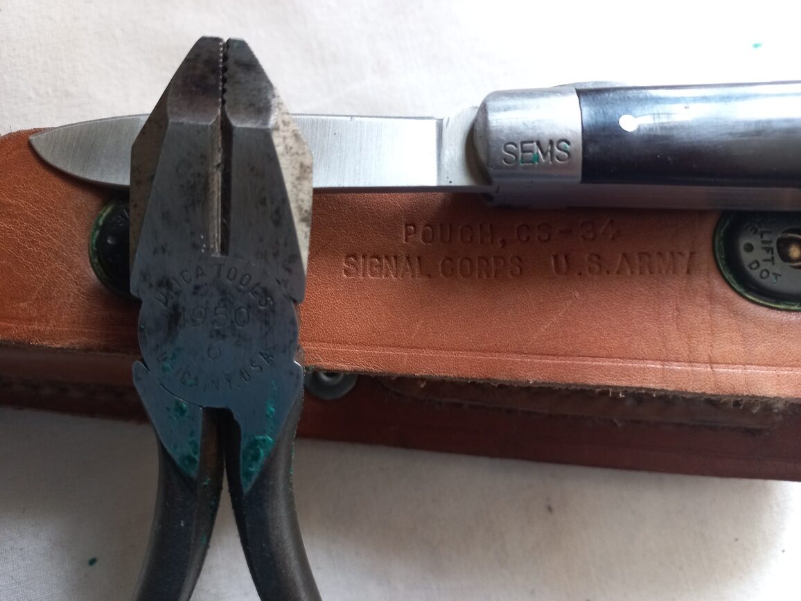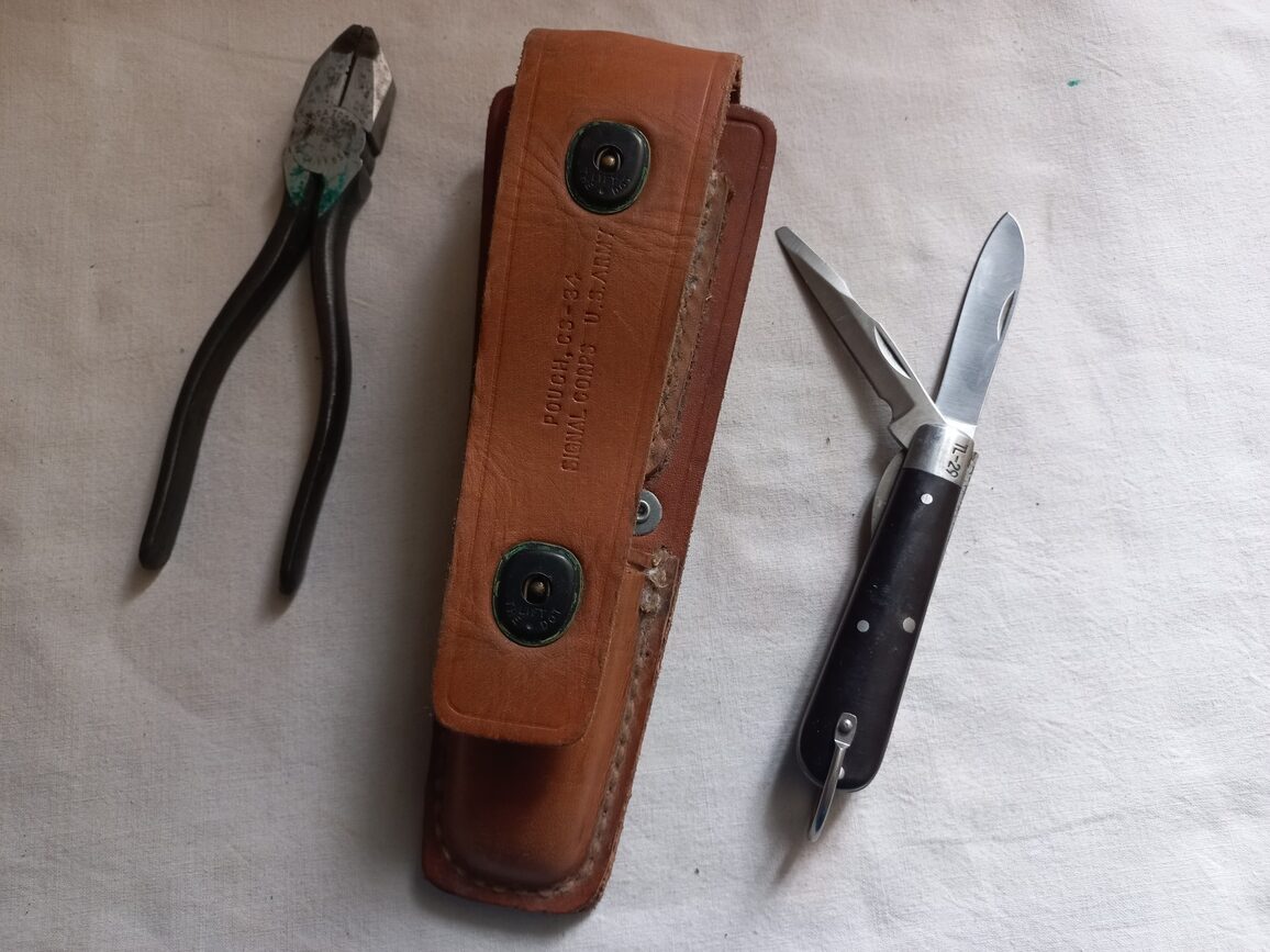 Trousse en cuir CS 34 en TTBE avec couteau TL 29 SEMS et pince TL 13 UTICA. Ensemble 100 % US WWII complet et d’origine utilisé par les monteurs de ligne du signal corps ou les équipes de démolition du génie US.